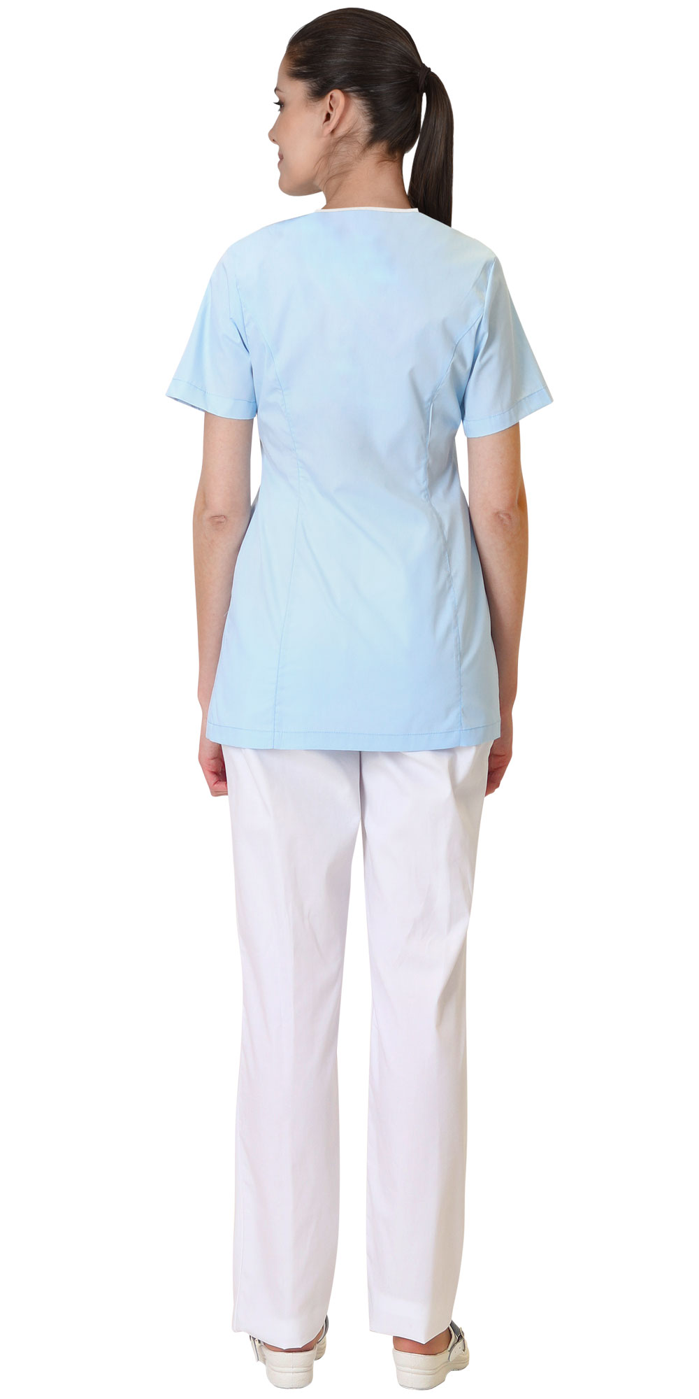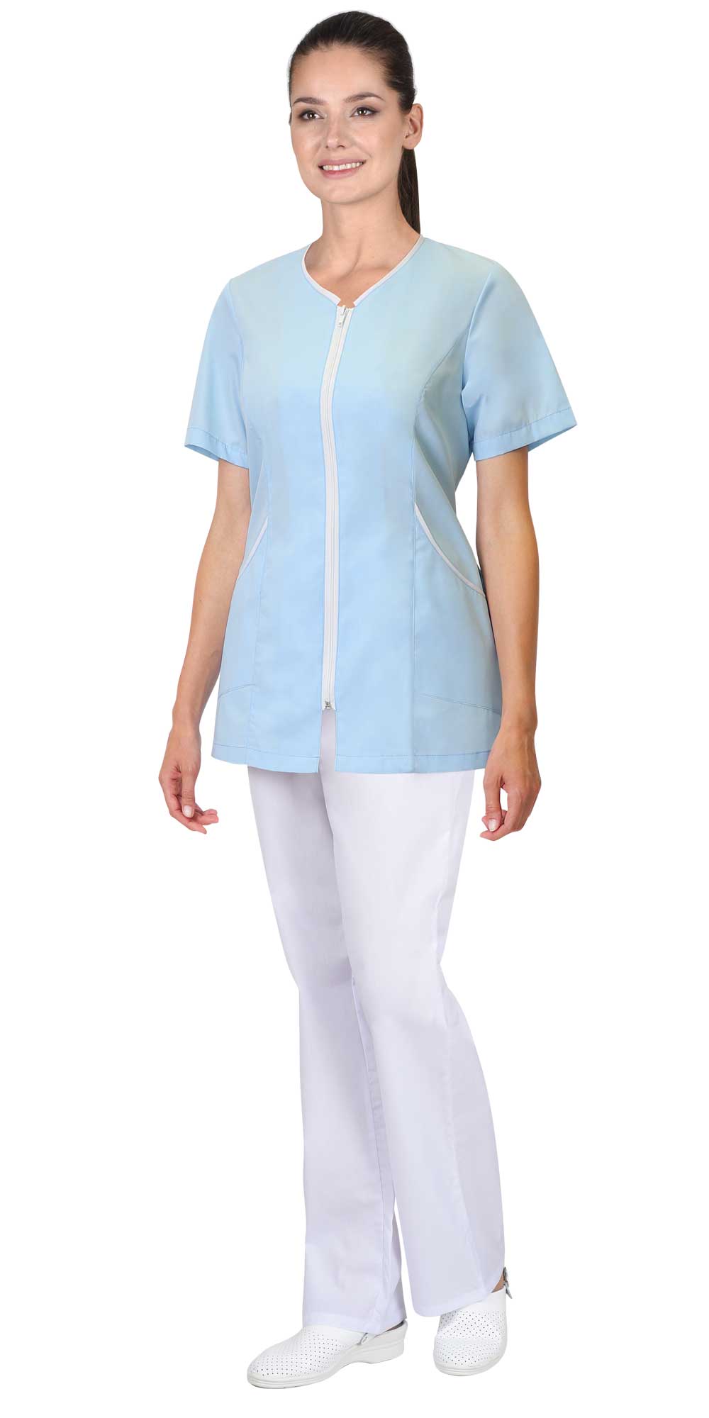 Блуза женская из ткани голубого цвета с белой отделкой, полуприлегающего силуэта, с центральной застёжкой на тесьму «молния», без воротника, с V – образным вырезом, с боковыми накладными карманами. Рукава втачные короткие. По горловине и верхнему краю кармана вставлен кант шириной 5мм из ткани отделка.