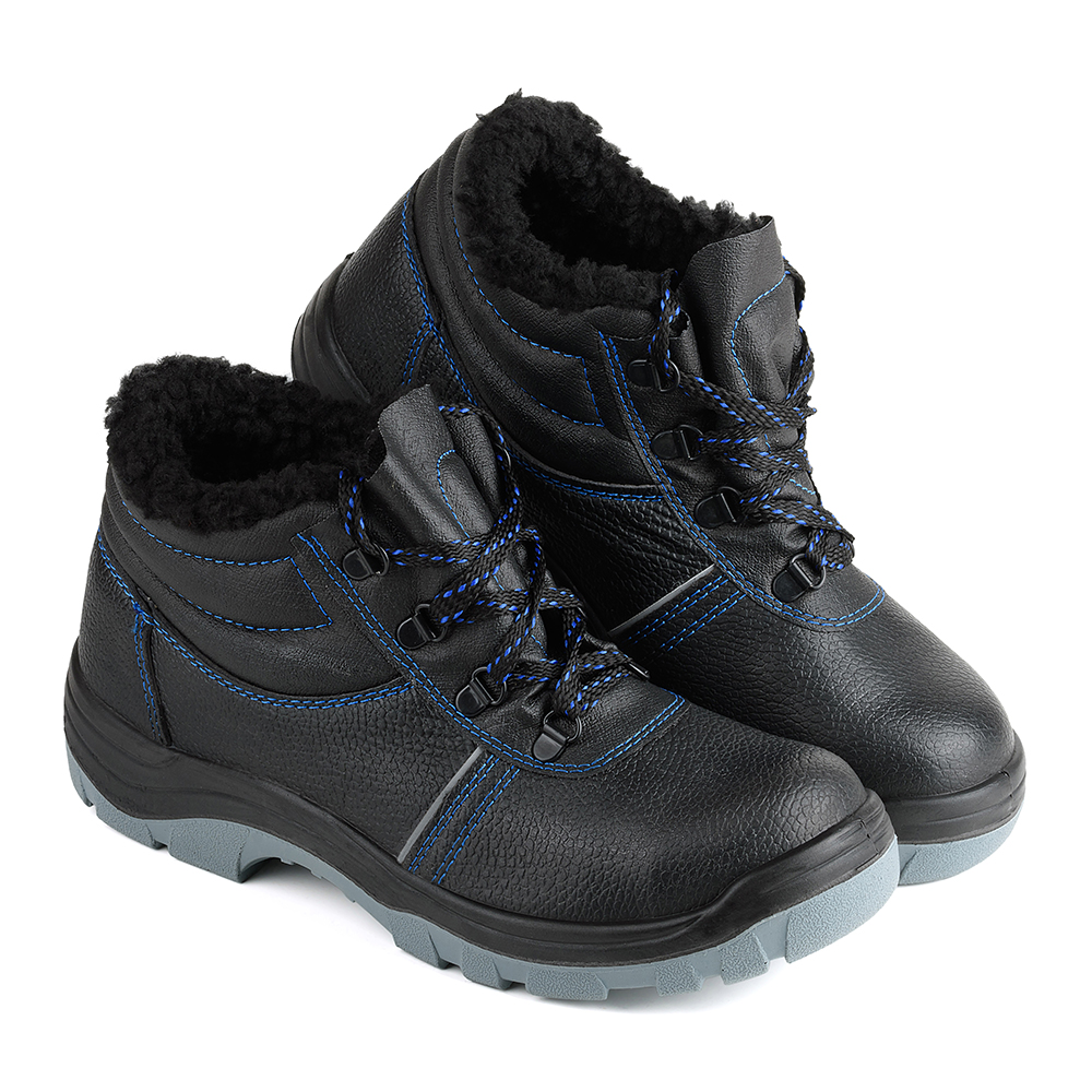 Ботинки изготовлены методом литья промежуточного слоя подошвы из полиуретана к заготовке верха обуви. На промежуточный слой из полиуретана прилит ходовой слой из полиуретана высокой плотности с повышенными антискользящими свойствами. Имеется пристроченная прилитая задинка. Верх ботинок изготовлен из натуральной кожи. Подкладка ботинок из искусственного меха. В верхней части ботинок мягкий кант. Ботинки завязываются на шнурки и имеют глухой клапан. Шнуровка с использованием металлических люверсов. На глухом клапане мягкая вставка из поролона. Стелька вкладная. В носочной части термопластичный подносок ударной прочностью 5 Дж. На боковинах световозвращающие элементы в виде полосок. Выполнена контрастная отстрочка синего цвета в тон подкладки и цветной нити на шнурках. Подошва двухслойная, оба слоя из полиуретана разной плотности, маслобензостойкая. Есть внутренняя амортизирующая вставка в пяточной части подошвы. Глубина профиля ходового слоя подошвы составляет 3,5 мм. Цвет ботинок черный.