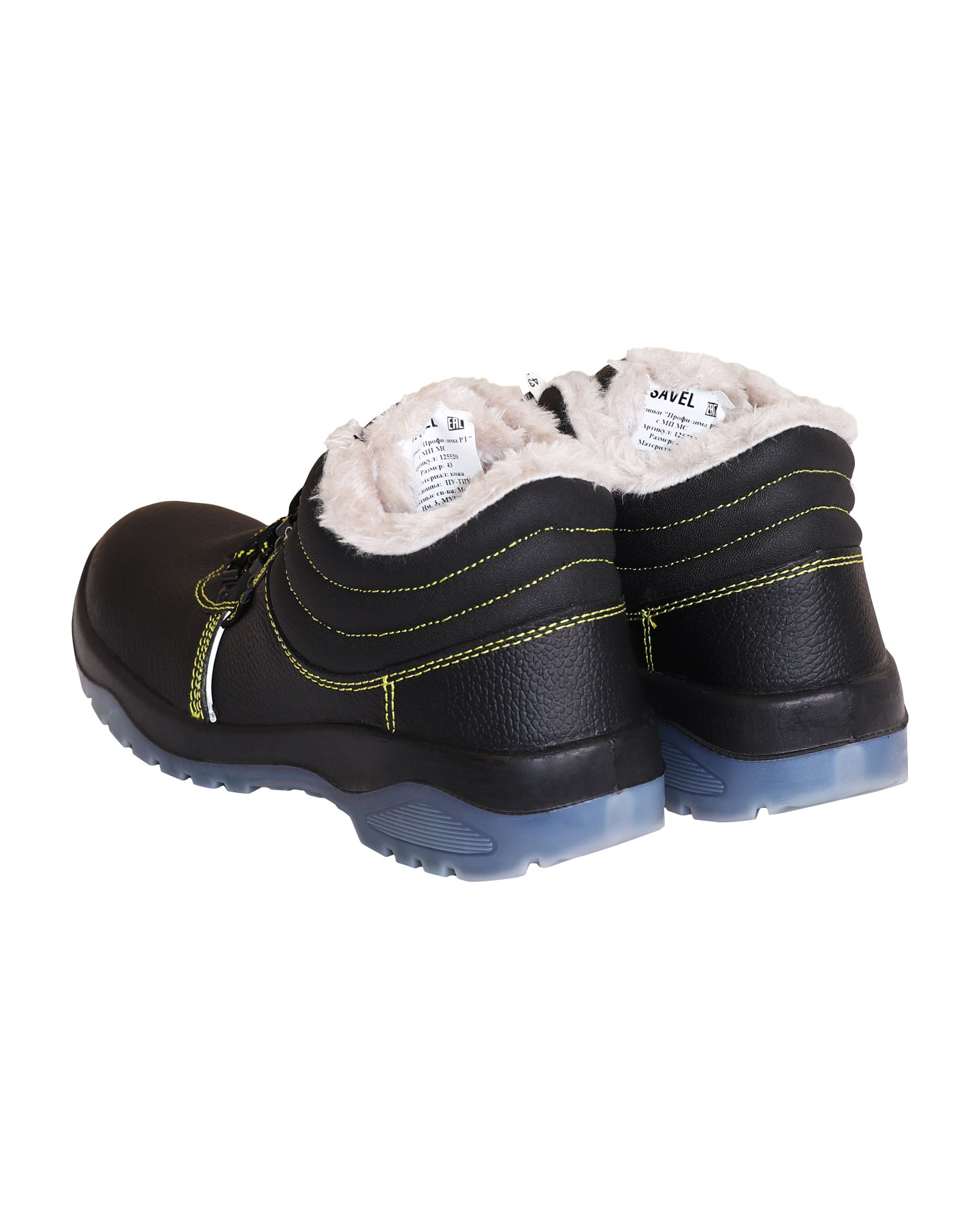Подклад в утеплённых ботинках серии "SAVEL-Профи" серого цвета и выполнен из искусственного меха. Верх ботинка имеет контрастные отделочно-скрепляющие строчки жёлтого цвета.