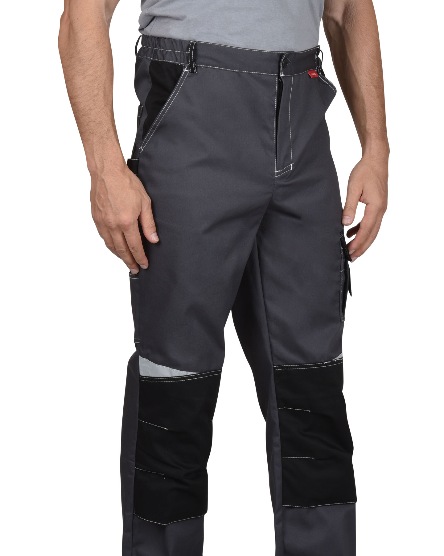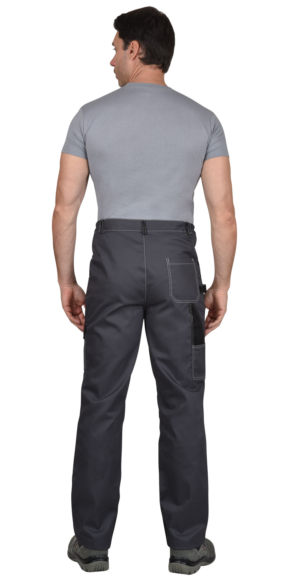 Брюки прямые; с застёжкой гульфика на тесьму - «молния»; с застежкой пояса на одну петлю и пуговицу; с боковыми внутренними карманами; с карманами и фигурными клапанами застегивающиеся на потайную липучку на боковом шве; с фигурным карманом на задней половинке; с карманами под инструменты; с наколенниками. Пояс брюк частично стянут резинкой ткацкой по бокам. В брюках предусмотрена лента светоотражающая (мелкодисперсная белая) 50 мм фигурной формы.