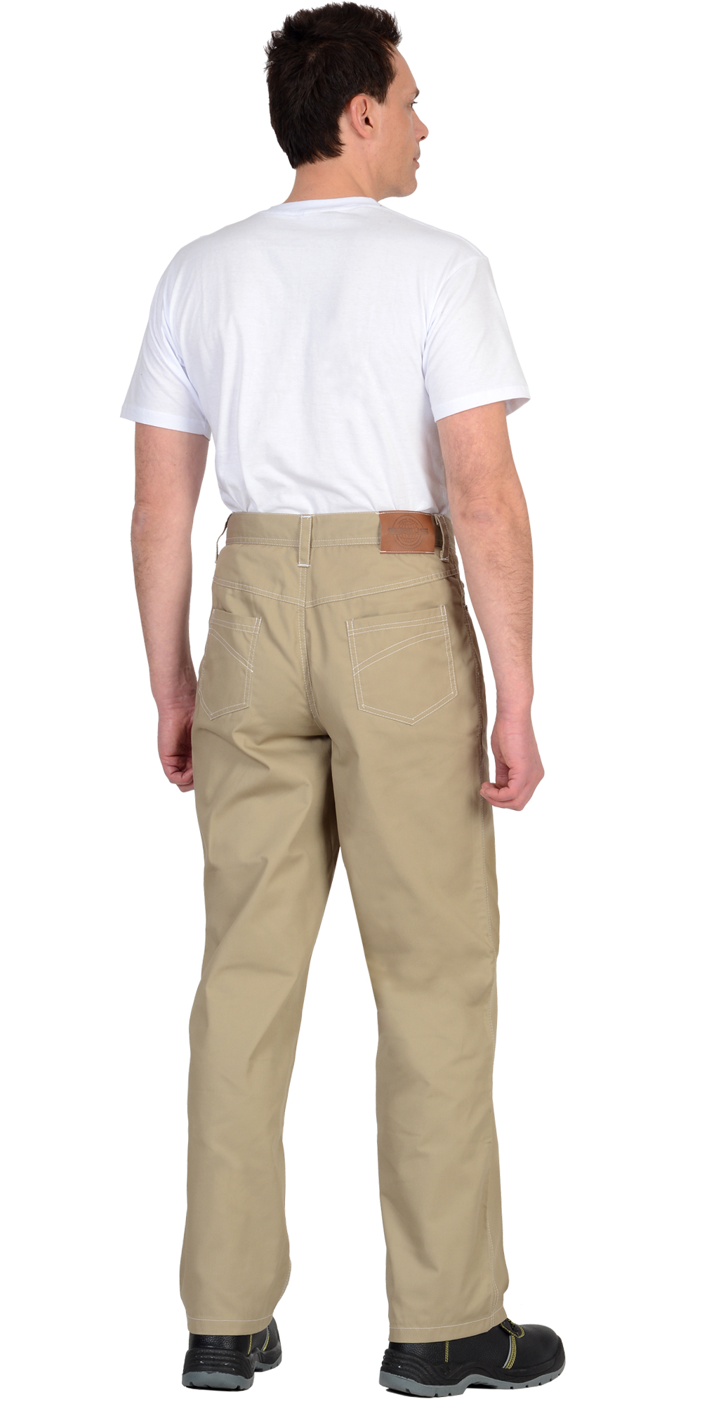 Брюки с застежкой спереди на тесьму "молния", боковыми внутренними карманами, отрезной кокеткой и двумя накладными карманами на задних половинках, с притачным поясом со шлевками, застегивающимся на петлю и пуговицу. Со стороны спинки справа на пояс настрачивается кожаная нашивка-логотип "Сириус".