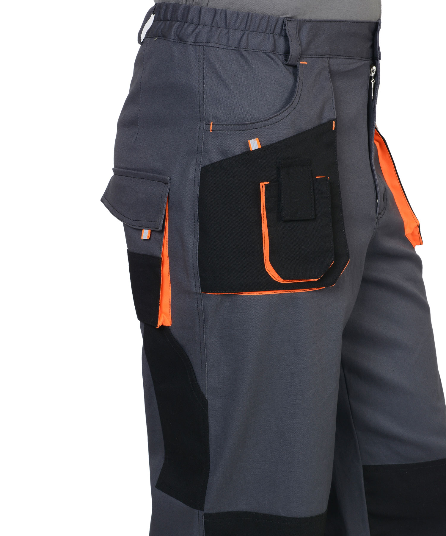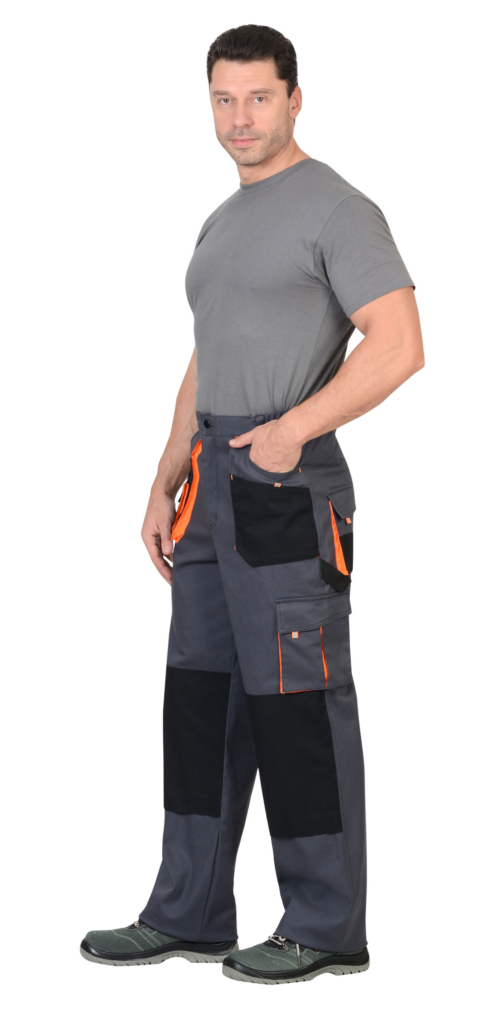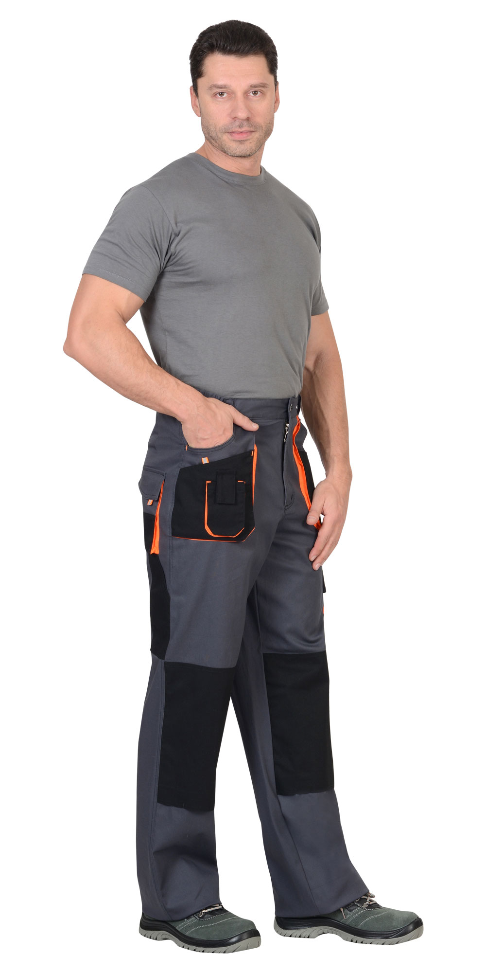 Брюки с застёжкой гульфика на молнию, с поясом на резинке, со шлевками, с накладными боковыми объемными карманами, с объемными наколенниками, с накладным объемным карманом на боковом шве с клапаном на липучке, двумя объемными карманами с клапанами на задних половинках, и карманами для инструментов.Ткань верха: с эффектом "Стрейч", смесовая с МВО пропиткой.Состав: 98% х/б, 2% эластан, поверхностная плотность 250 г/м2.Цвет: темно серый