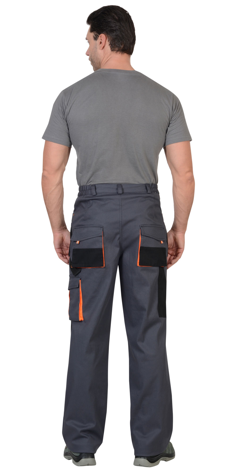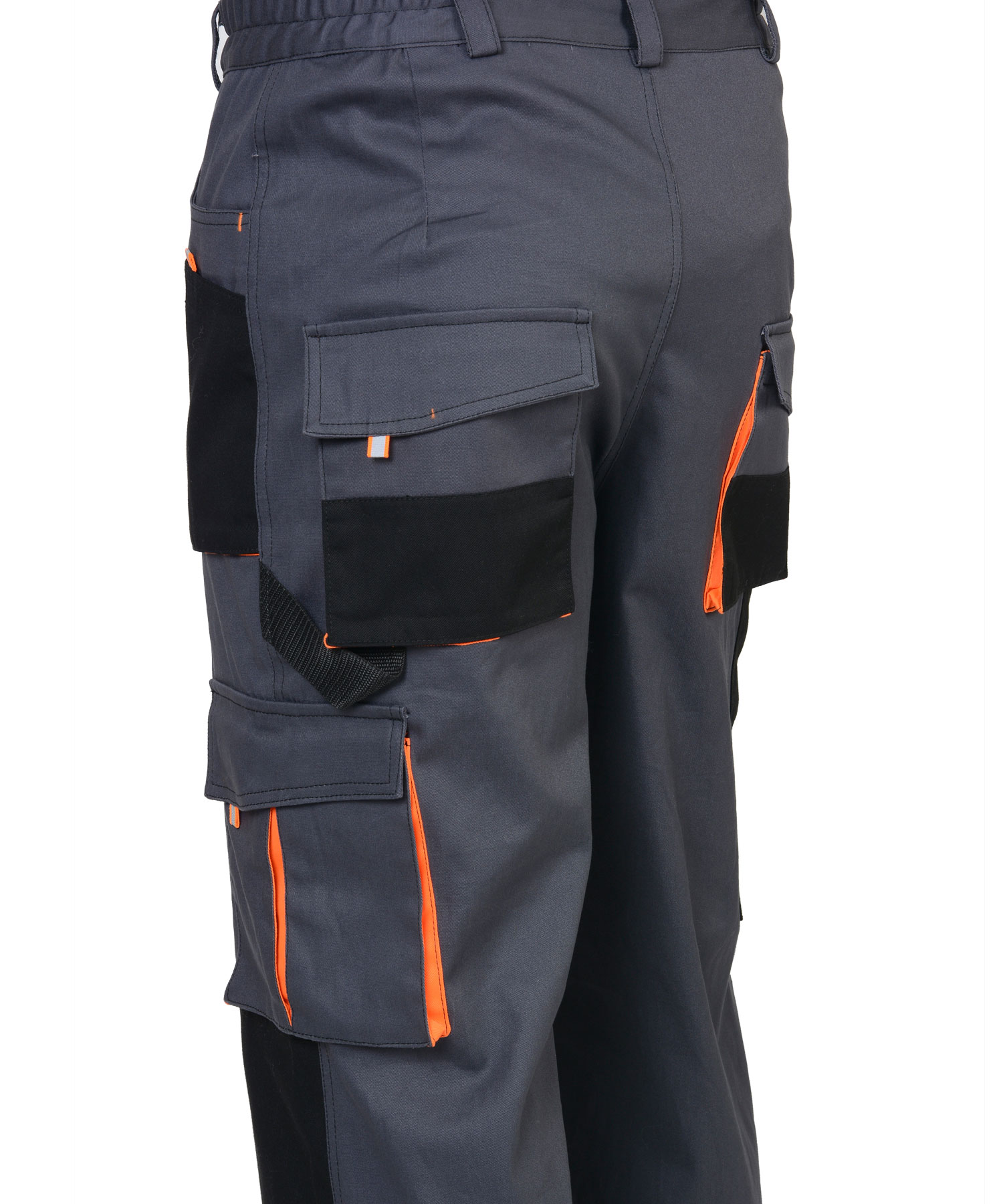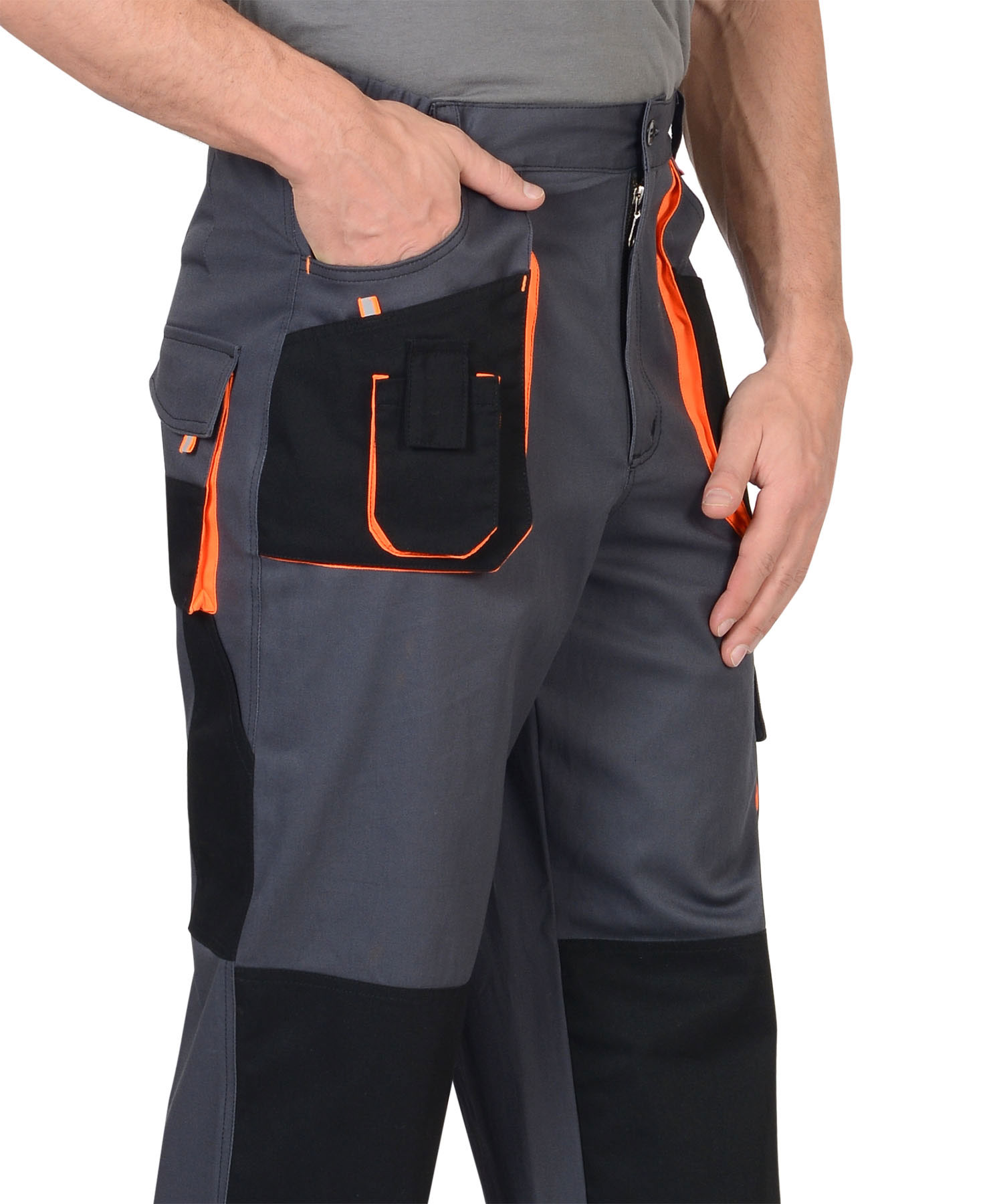 Брюки с застёжкой гульфика на молнию, с поясом на резинке, со шлевками, с накладными боковыми объемными карманами, с объемными наколенниками, с накладным объемным карманом на боковом шве с клапаном на липучке, двумя объемными карманами с клапанами на задних половинках, и карманами для инструментов.Ткань верха: с эффектом "Стрейч", смесовая с МВО пропиткой.Состав: 98% х/б, 2% эластан, поверхностная плотность 250 г/м2.Цвет: темно серый