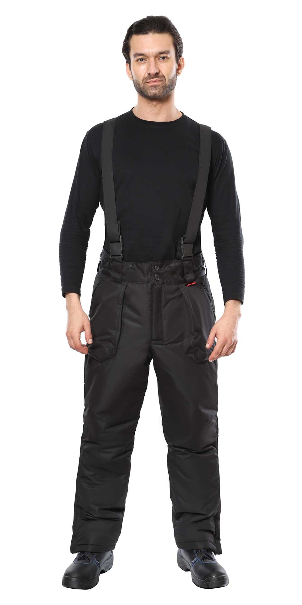 Брюки прямые на утеплённой подкладке, с застежкой спереди на молнию – гульфик. Брюки с широким поясом с застежкой на 2 пуговицы, с боковыми накладными карманами с молнией, со съёмными бретелями. Бретели пристегиваются к брюкам при помощи пуговиц и петель, регулируются по длине защелками-фастексами. По боковым швам внизу разрез с молнией. В брюках на задних половинках предусмотрен кант СВМ 3мм 100К для обозначения сигнальной видимости.