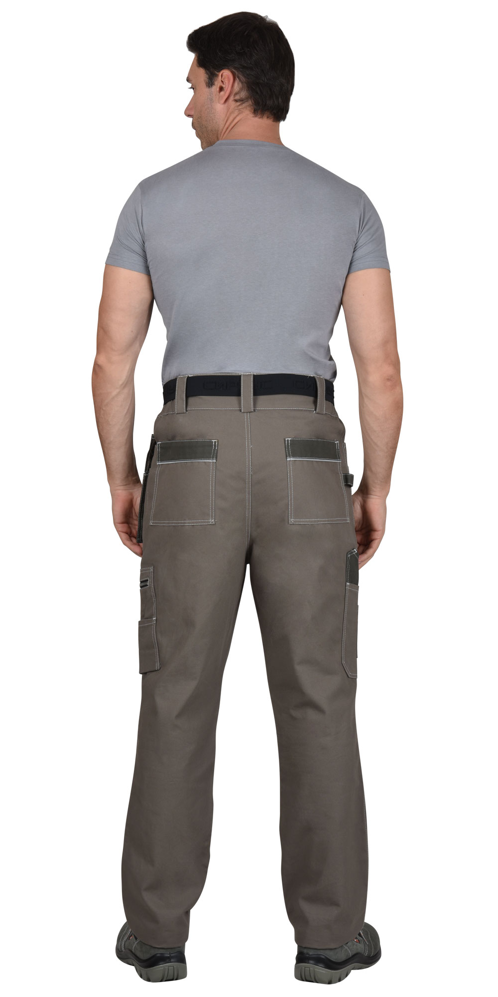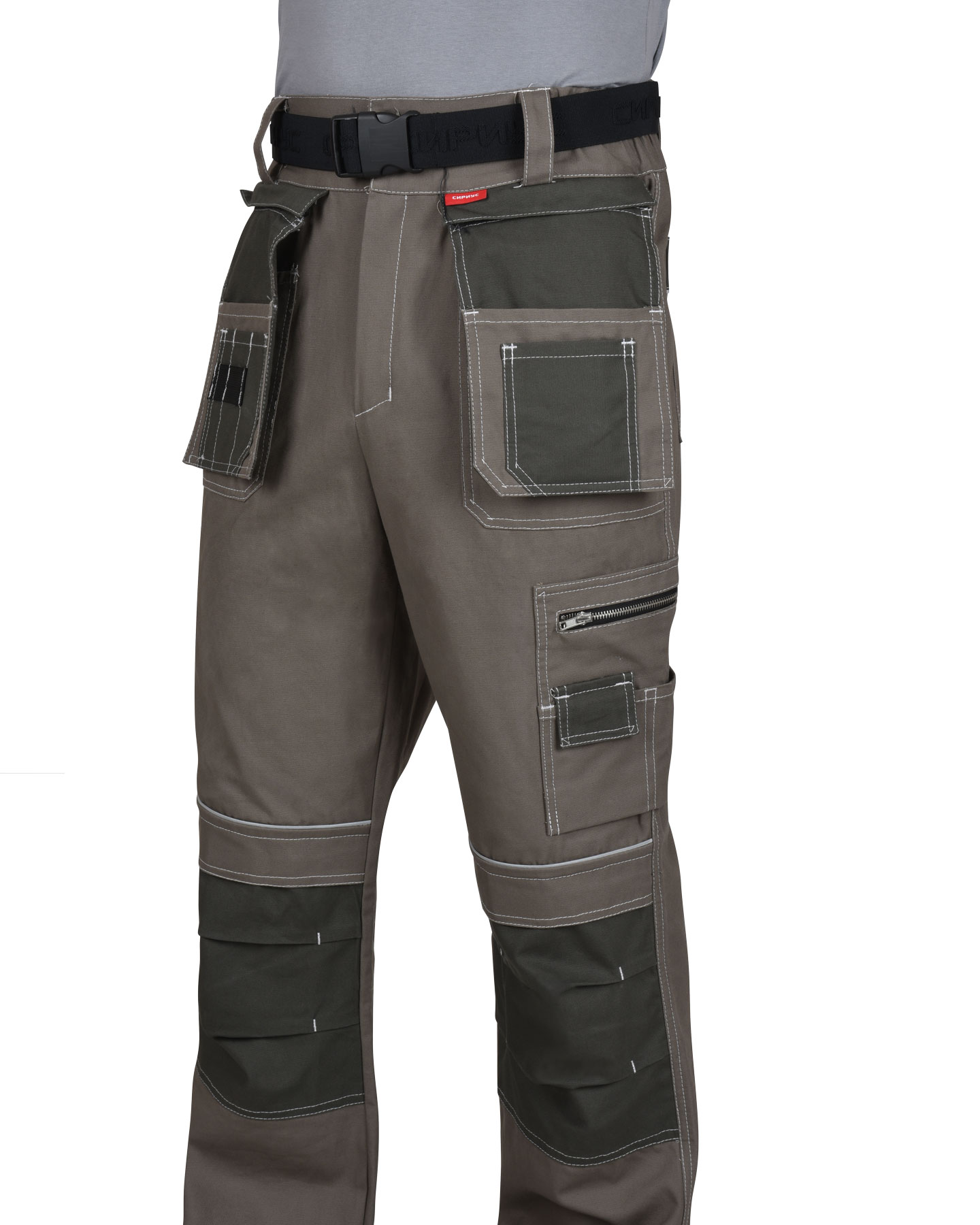Брюки выполнены из ткани "Канвас Комфорт", прямого силуэта, с притачным поясом, с застежкой гульфика на тесьму – «молния», с различными многофункциональными карманами и объёмными наколенниками. В брюках предусмотрен ремень из резинки ременной «Сириус» застегивающийся на защелку-фастекс.