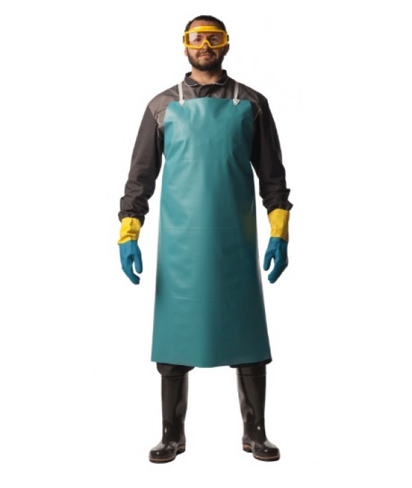 Прочный износоустойчивый фартук из уплотненного поливинилхлорида (ПВХ) предназначен для защиты от брызг кислот и щелочей концентрации до 80%, продуктов нефтепереработки, масел, жиров, лаков и красок на их основе при выполнении средних и тяжелых работ.