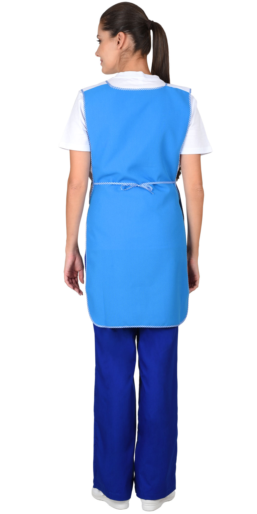 Фартук с круглым вырезом горловины, боковыми завязками для регулировки объема, с большим накладным карманом с зональным делением. Фартук по горловине, верхнему срезу кармана и края окантован окантовочной лентой из отделочной ткани. На фартуке в области кокетки выполнена аппликация.