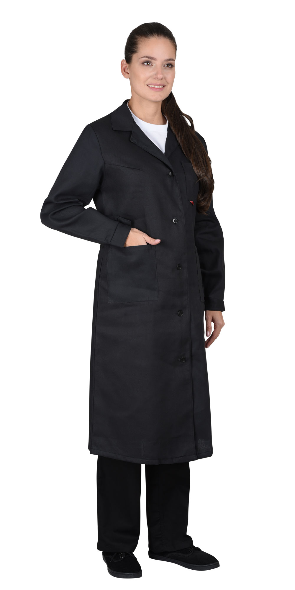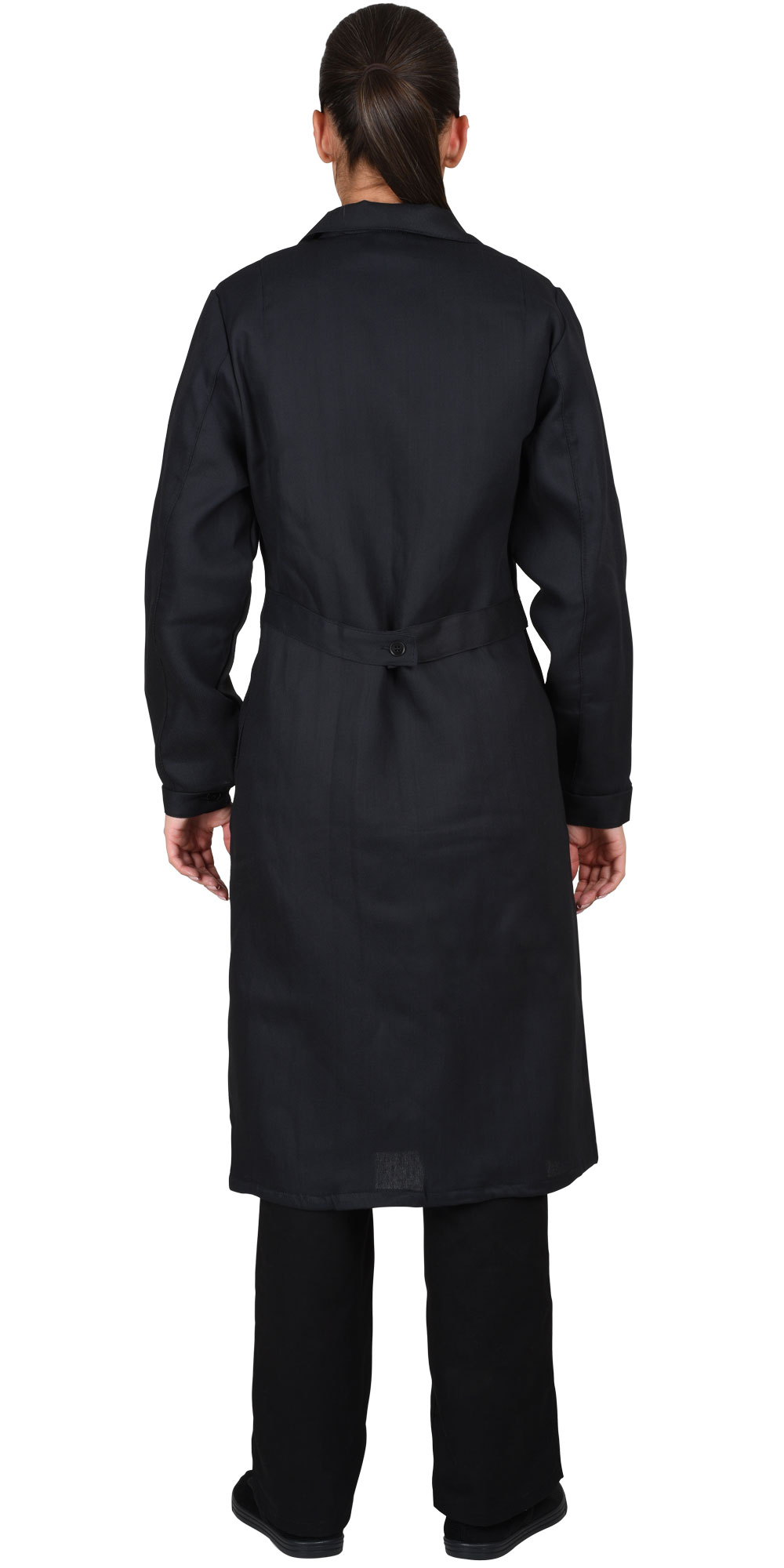 Тк. диагональ, 100% х/б. Отложной воротник, застёжка на пуговицы, два кармана. Манжеты рукавов на пуговице. По талии спинки - хлястик. ГОСТ 12.4.131-83.