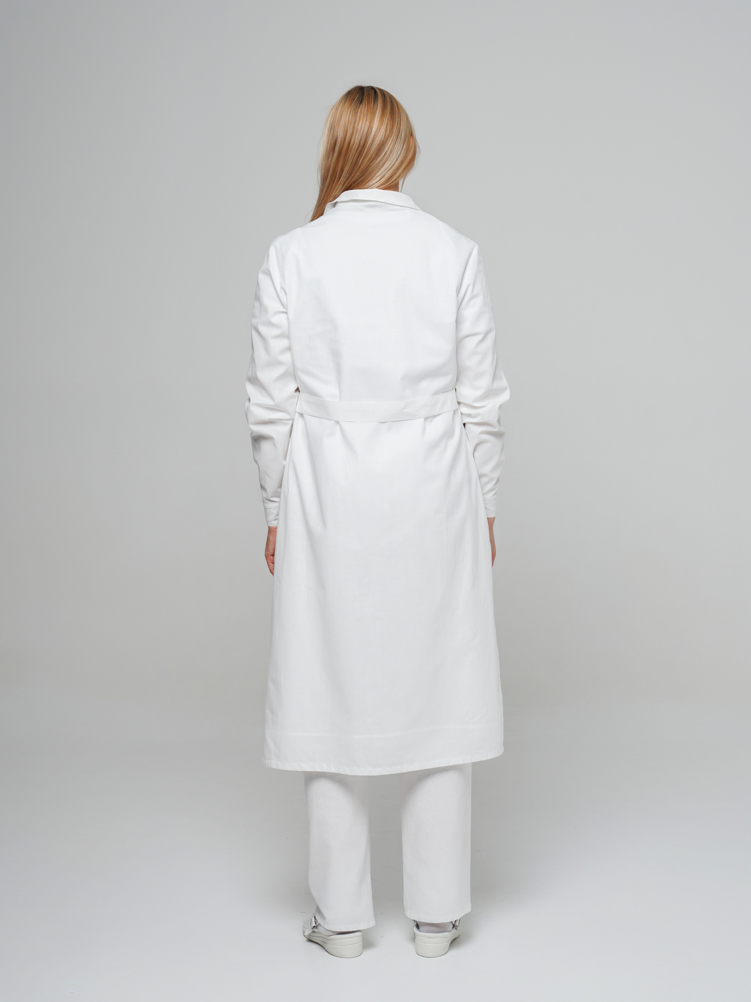 Тк. бязь, 100% х/б. Отложной воротник, застёжка на пуговицы, два кармана. Манжеты рукавов на пуговице. На спинке - хлястик. ГОСТ 12.4.280-2014.