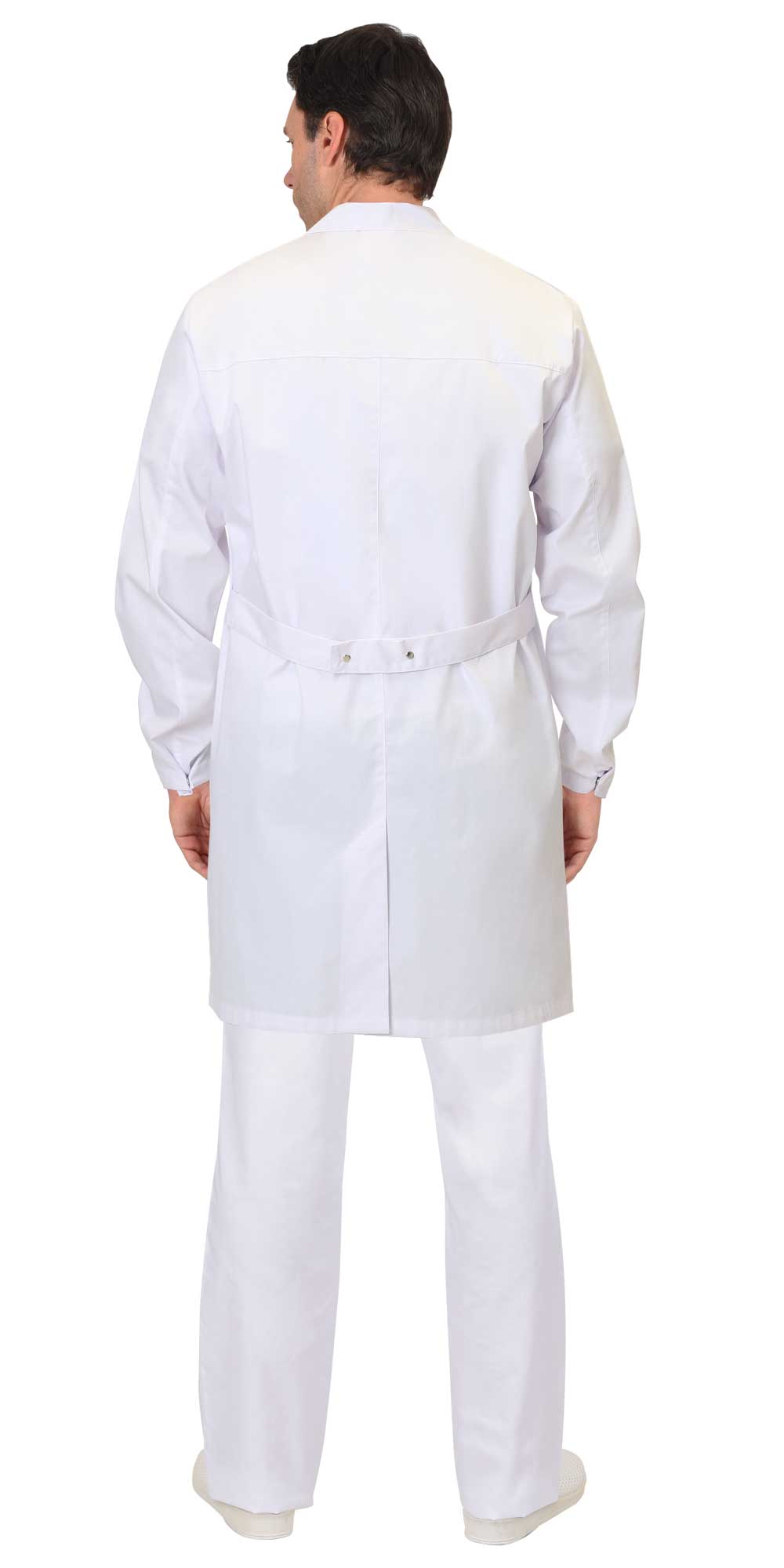 Халат мужской прямого силуэта с длинными рукавами, центральной застежкой на потайные кнопки и втачным отложным воротником. Внутренний нагрудный карман и внутренний карман на правом рукаве для пропуска.