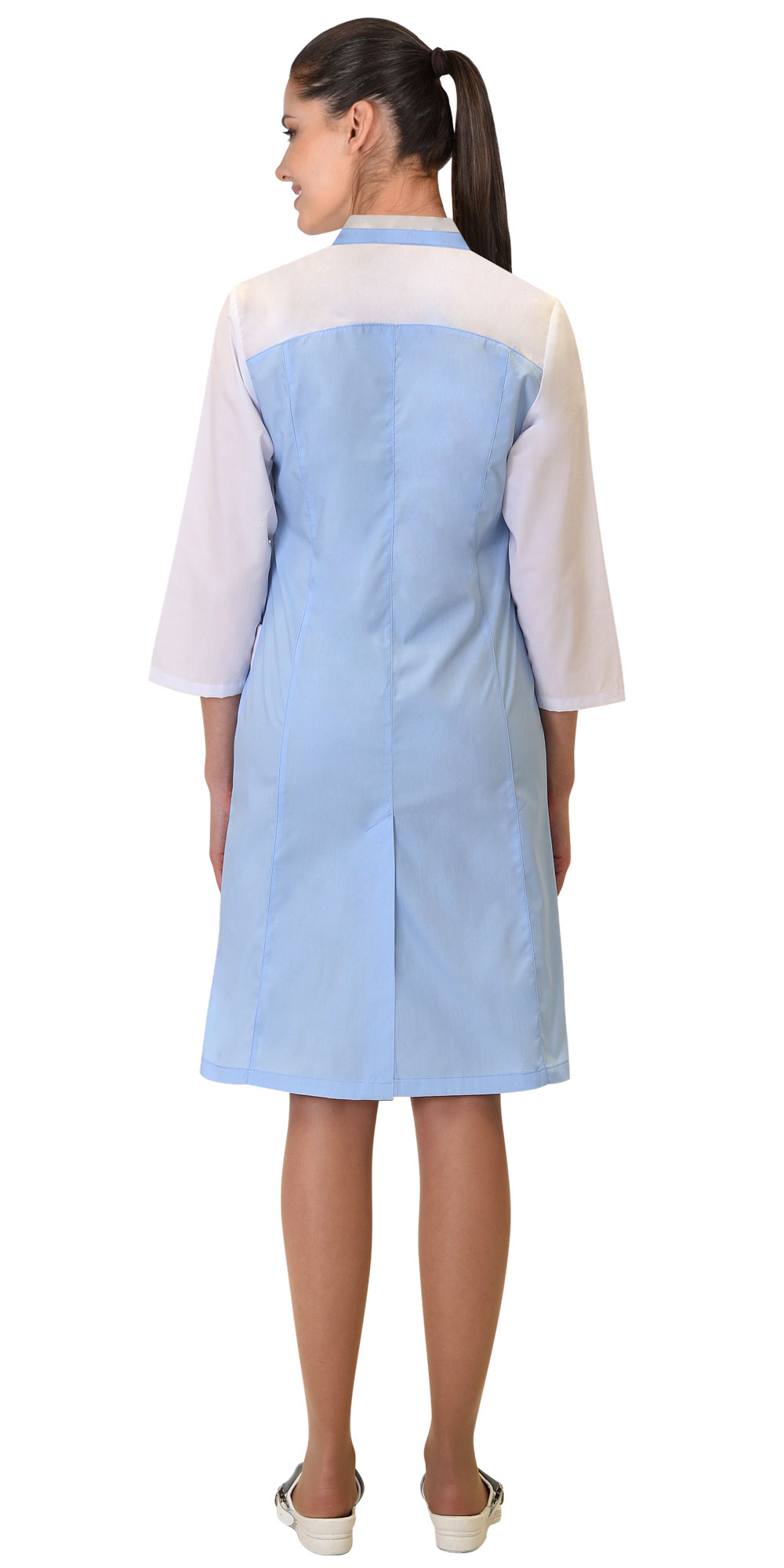 Халат полуприлегающего силуэта, с центральной застёжкой на 5 петель и пуговицы, с отложным воротником, с нижними накладными карманами с фигурными планками. Рукава 3/4. Цвет отделки: Голубой