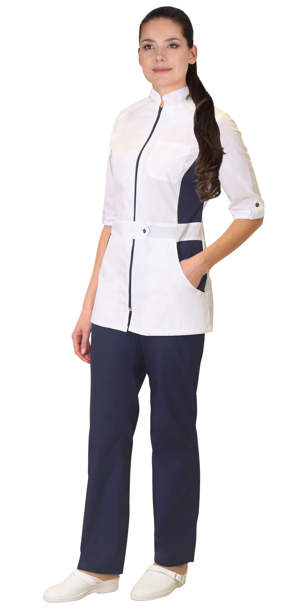 Костюм комбинированный из ткани двух цветов состоит из блузы белого цвета с отделкой и брюк тёмно-синего цвета.