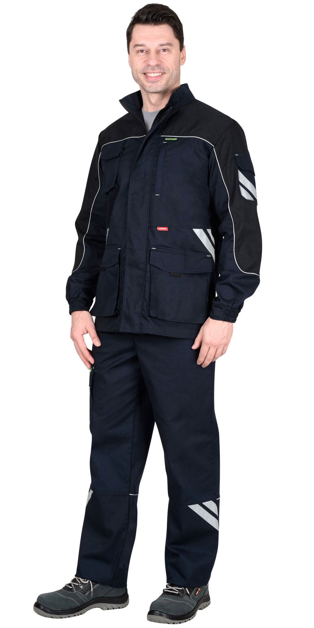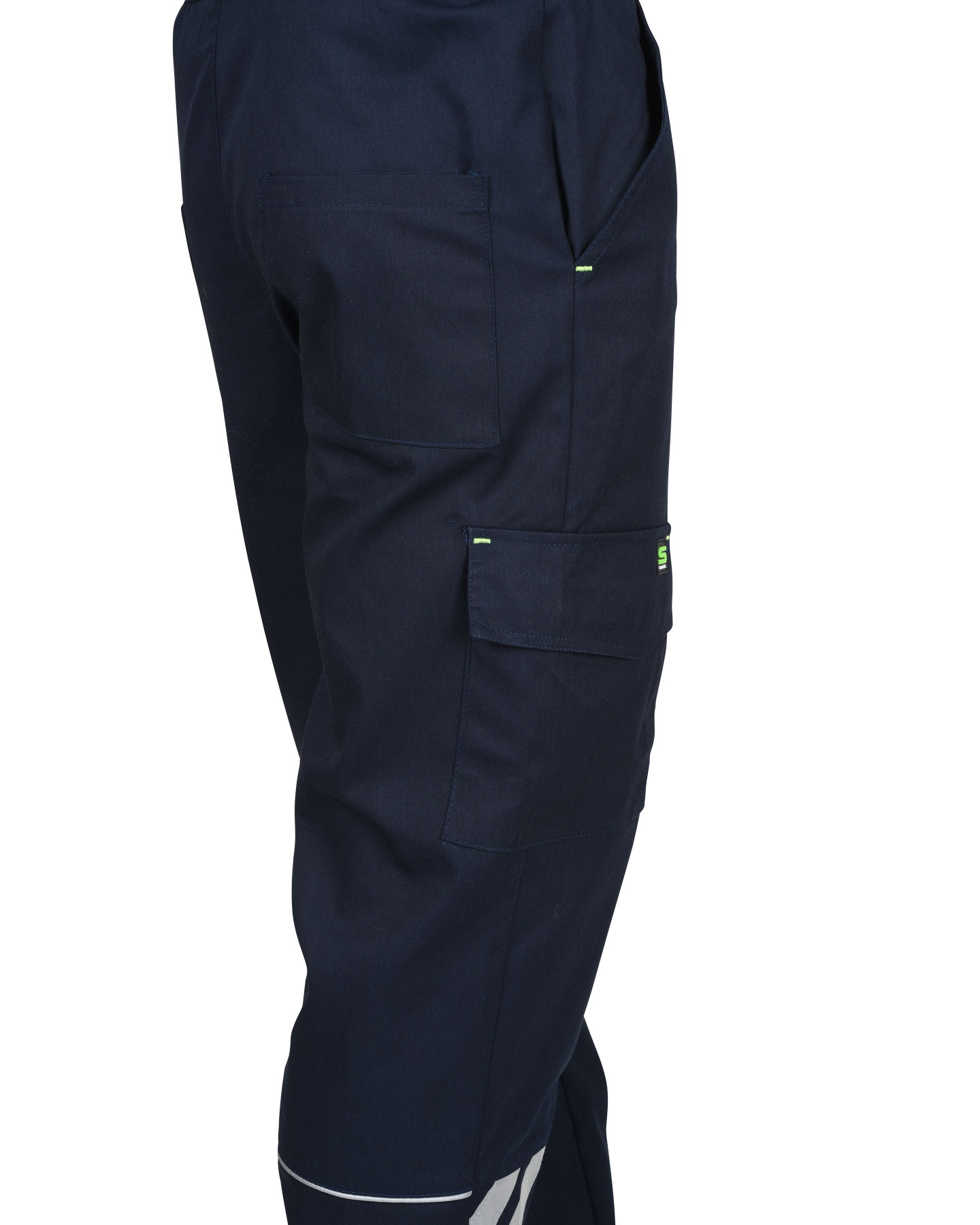 Брюки с притачным поясом с эластичной лентой по боковым швам, застегивающимся на пуговицу, со шлевками, с застежкой гульфика на молнию, с различными функциональными карманами, с элементами из СВ канта и СОП, обеспечивающие безопасность работы в условиях пониженной видимости.