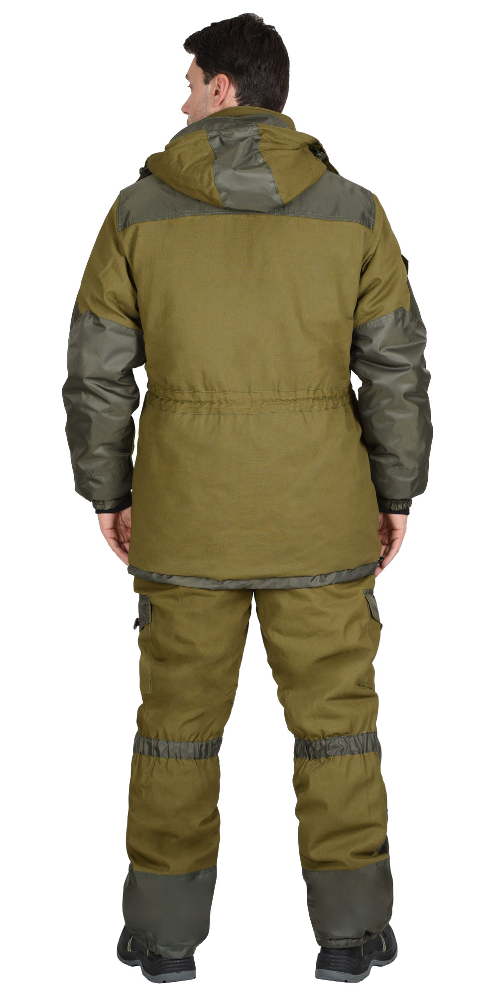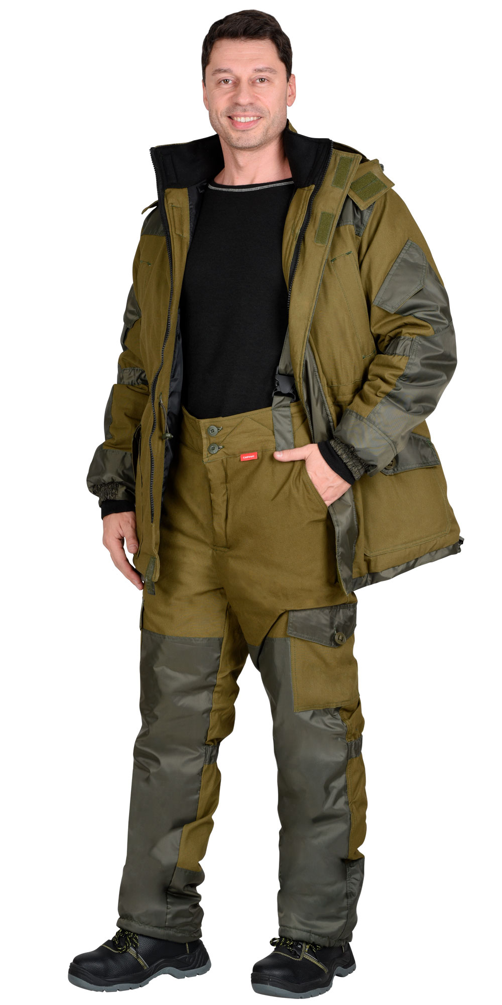 Куртка прямого силуэта с притачной утеплённой подкладкой, центральной застёжкой на двух замковую тесьму - "молнию" и ветрозащитным клапаном застегивающийся на липучку, воротником - стойка, верхним прорезными карманами "листочка", с нижними накладными фигурными карманами антивор и фигурными клапанами застегивающиеся на канадскую пуговицу. Рукава с полу объемными накладными карманами и фигурными клапанами застегиваются на потайную липучку, с манжетами на резинке, с налокотниками. Капюшон с козырьком, двумя кулисами для регулировки, застежкой на потайную липучку. По талии регулируется шляпной резинкой и двойным фиксатором. Низ куртки регулирует шляпной резинкой и фиксатором. На подкладке внутренний карман на молнии. Брюки с центральной застежкой гульфика на три петли и пуговицы, с притачным поясом застежкой на две петли и две пуговицы, с пятью широкими шлевками, со спинкой и бретелями, с боковыми карманами с наклонным входом, с накладными карманами на боковых швах с фигурными клапанами застегивающиеся на канадскую пуговицу, с накладками передних половинок и накладками низа задних половинок. Ткань верха: "Палатка", состав: 100% х/б, пл. 260 г/м2Ткань верха отделочная: "Оксфорд", состав: 100% п/э, пл. 200 г/м2Ткань подкладочная: "Флис": состав 100% п/э, пл. 180 г/м2,"Таффета", 100 % - п/эУтеплитель: "Синтепон" пл.150 г/м2, полочки, спинка - 3 слоя (450 г/м2),рукава, передние и задние половинки брюк - 2 слоя (300 г/м2)