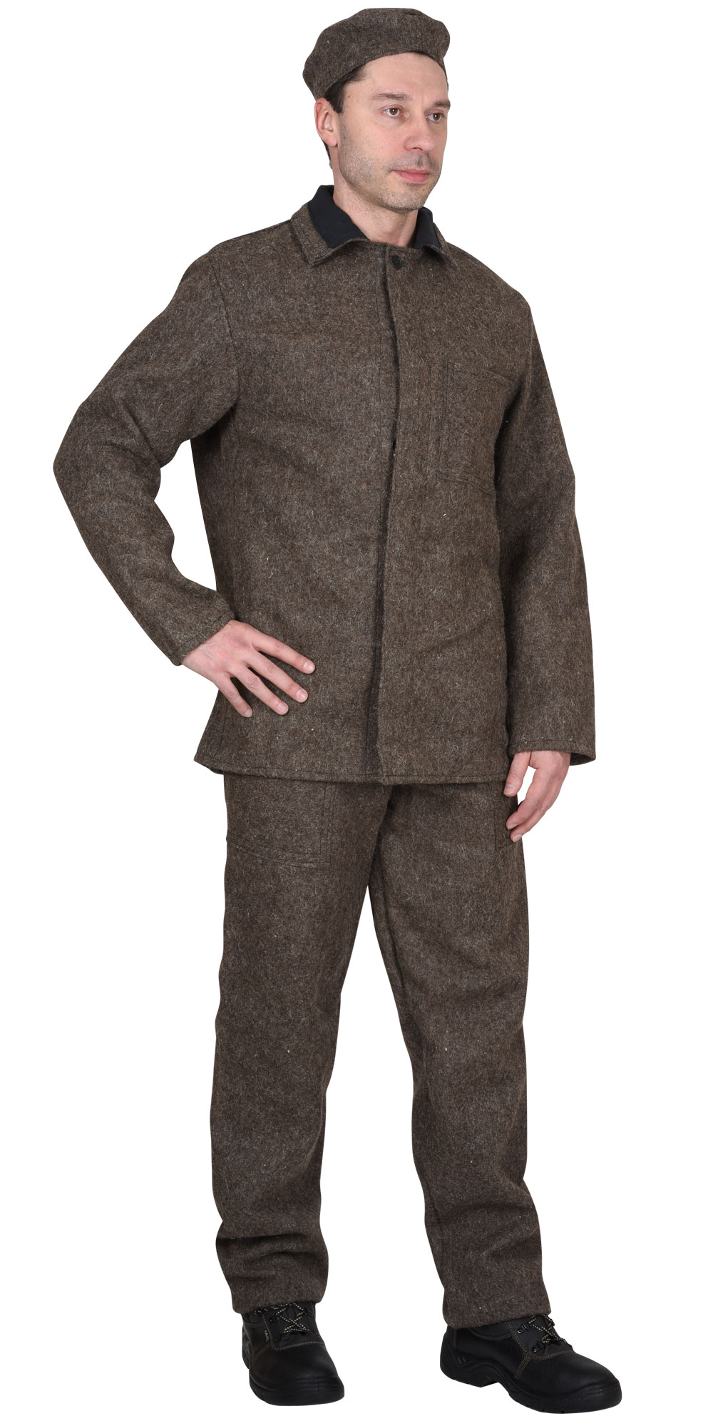 Сукно КЩС, пл. 760 г/кв.м, серое. Куртка с пот. застёжкой на пуговицы, отложным воротником, карманами. Брюки с застёжкой гульфика на пуговицы. Размерный ряд: с 88-92 по 120-124