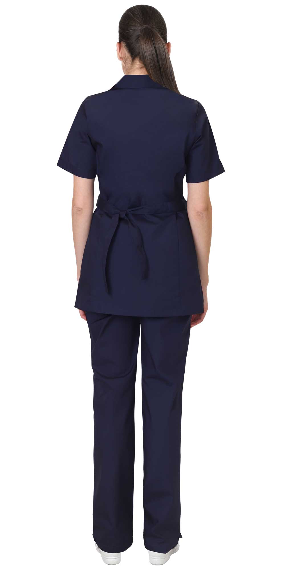 Костюм женский состоит из блузы и брюк темно-синего цвета.