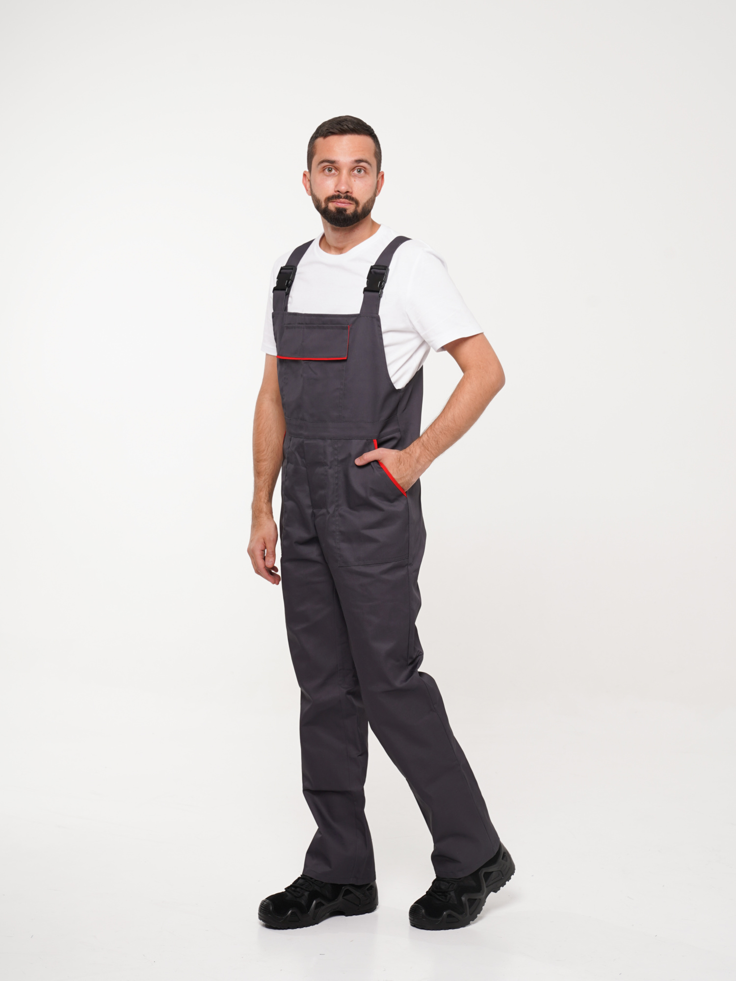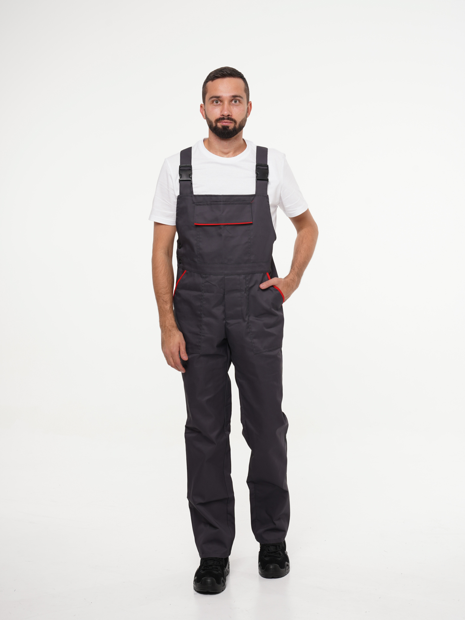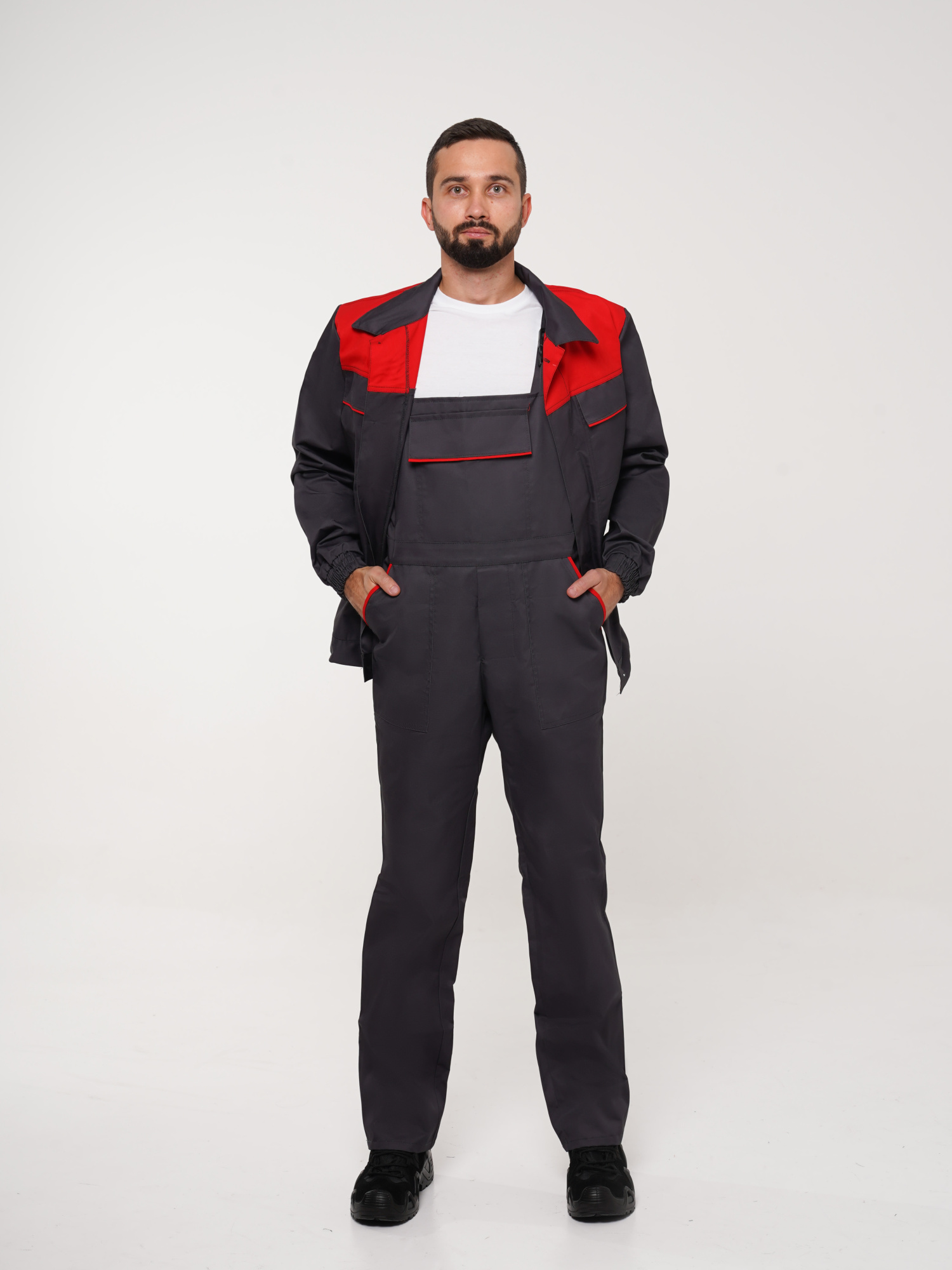 Костюм рабочий Сириус-Мастер №112 т.серый с красным (куртка, полукомбинезон) (ЧЗ) (104-108/182-188)