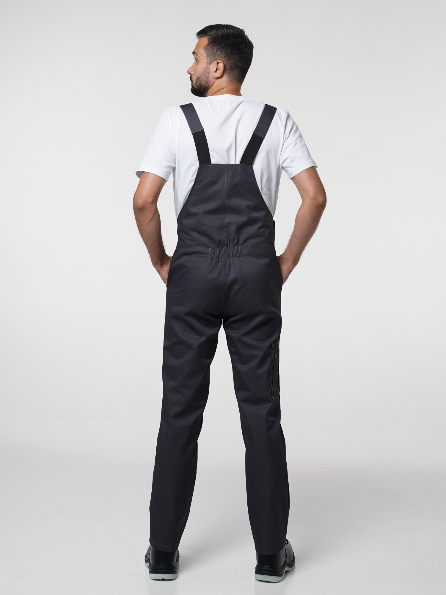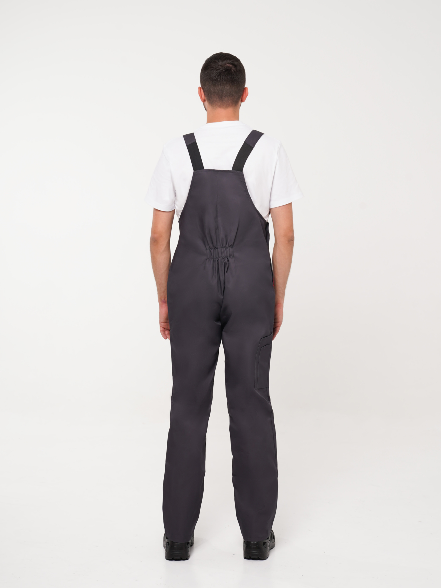 Полукомбинезон прямого покроя, с застёжкой гульфика и застёжкой в правом боковом шве на пуговицы, с карманом и клапаном на нагруднике, с боковыми накладными карманами и карманами для инструментов.