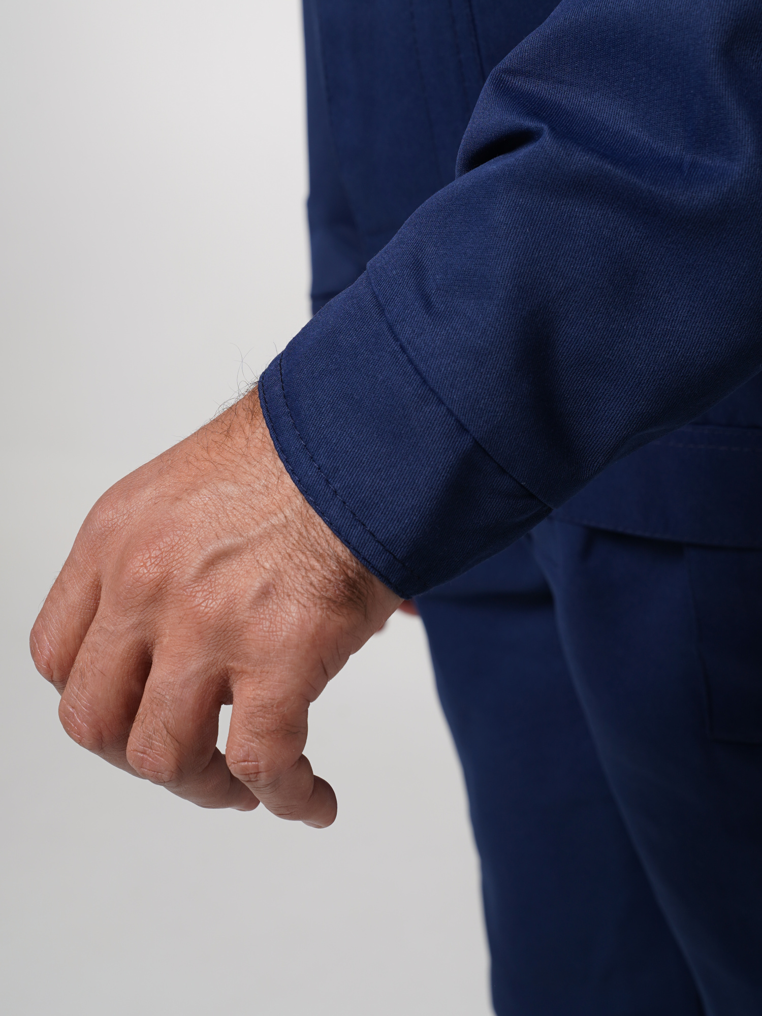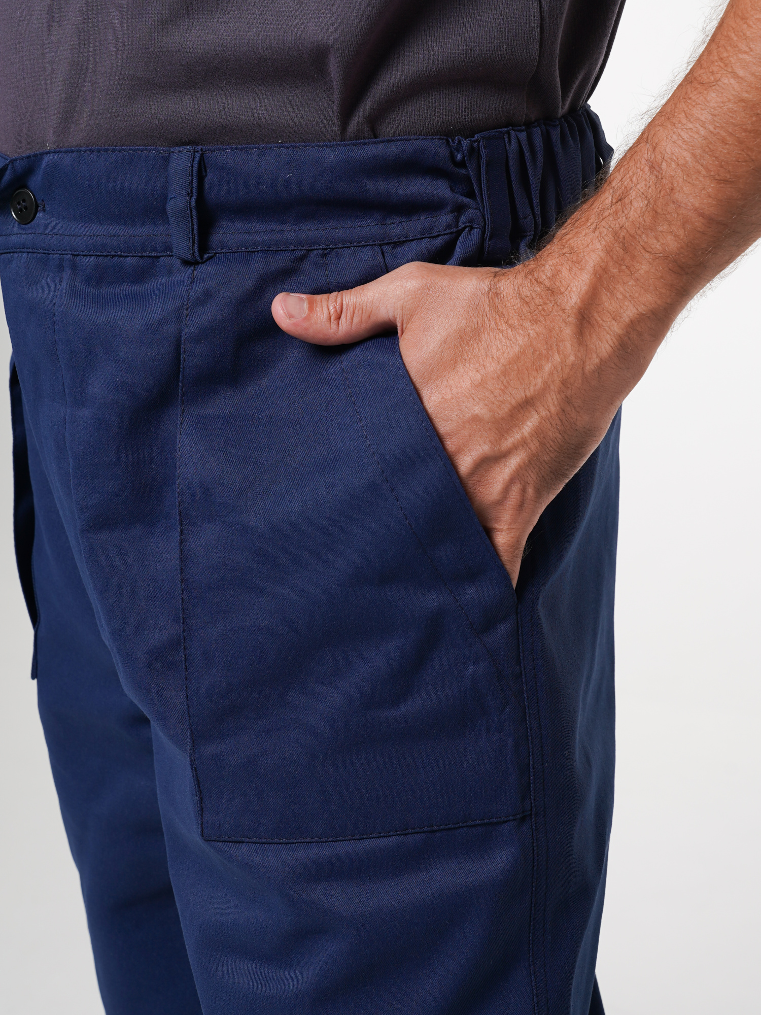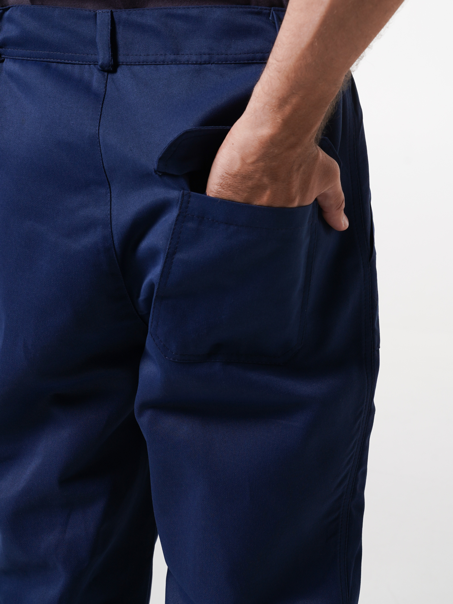 Передние половинки брюк с накладными карманами. Костюм отстрочен отделочными нитками синего цвета.