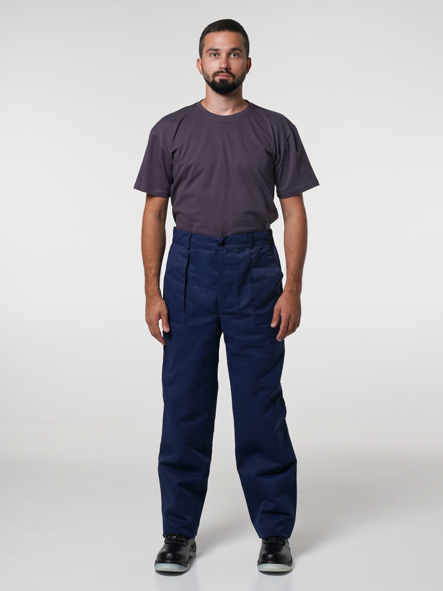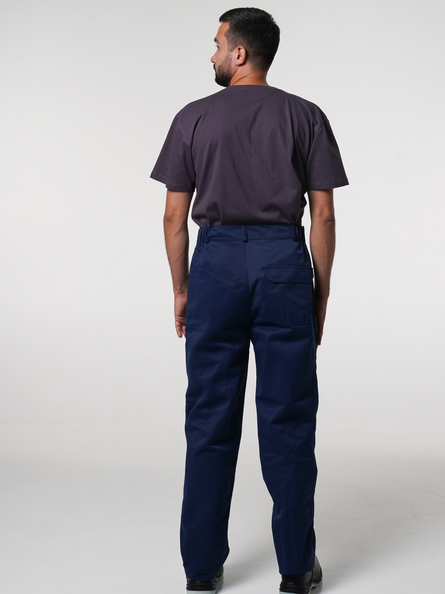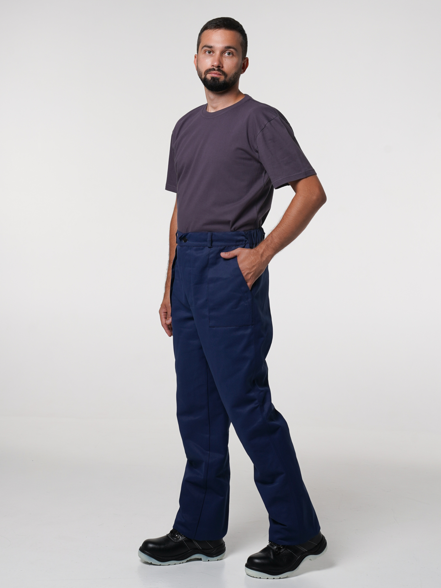 Передние половинки брюк с накладными карманами. Костюм отстрочен отделочными нитками синего цвета.