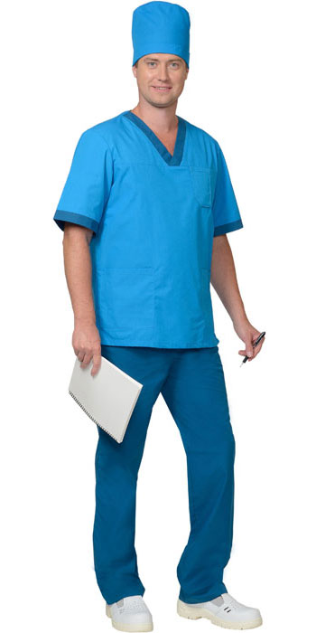 Костюм состоит из куртки, брюк и колпака. Куртка прямого покроя с V-образным вырезом горловины. На полочке один верхний и два нижних накладных кармана. Рукава короткие. Вырез горловины и манжеты рукавов из контрастной ткани. Брюки прямого покроя на резинке. Колпак одноцветный с отворотом.