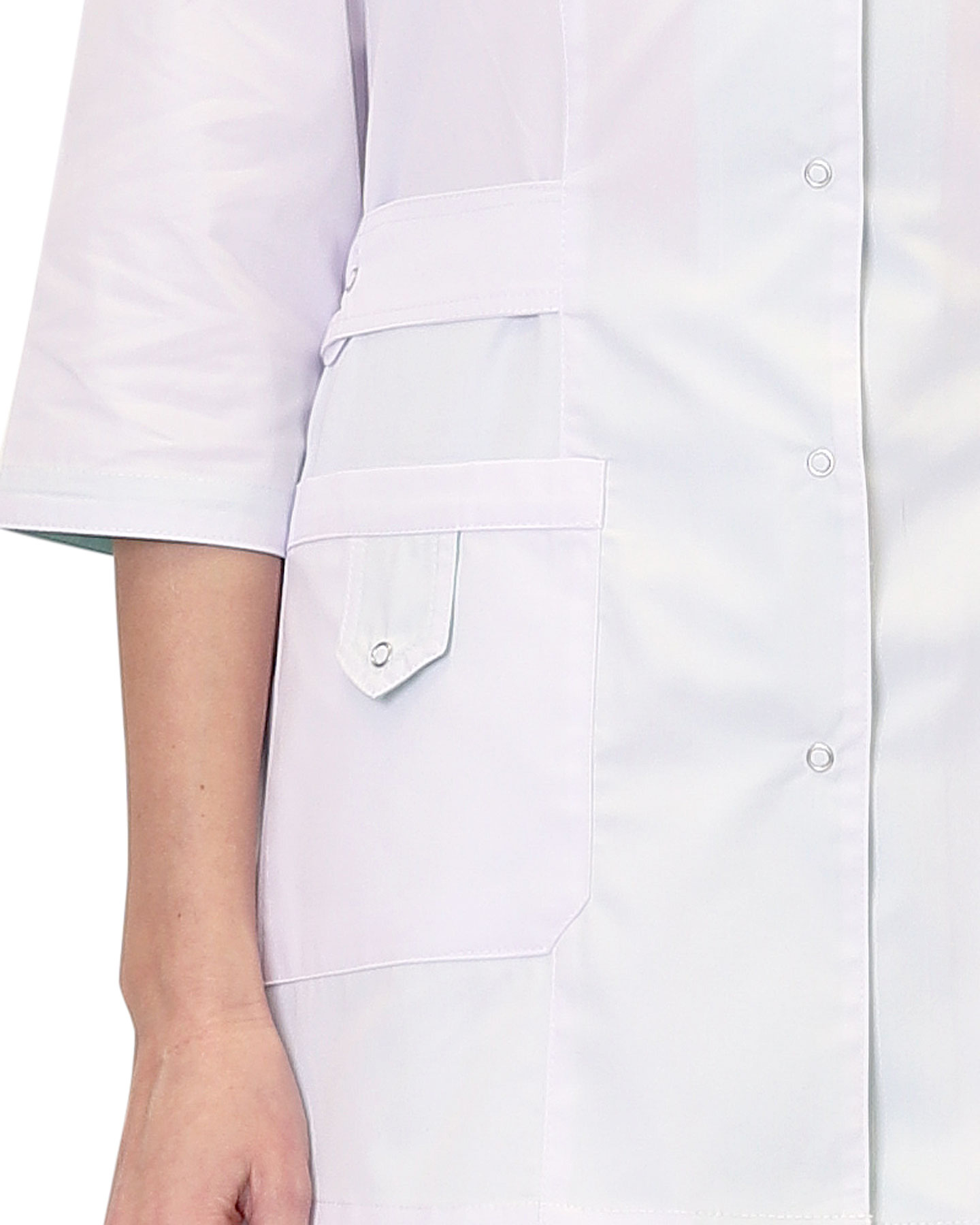 Костюм женский, комбинированный из ткани двух цветов, состоит из блузы белого цвета с отделкой и брюк из отделочной ткани. Блуза полуприлегающего силуэта с центральной сквозной бортовой застежкой на 6 кнопок. Воротник стойка. Два нижних накладных кармана. Рукава втачные, 3/4. Брюки прямые, с застёжкой на пуговицу и на тесьму «молния». Пояс частично стянут резинкой по боковым сторонам.