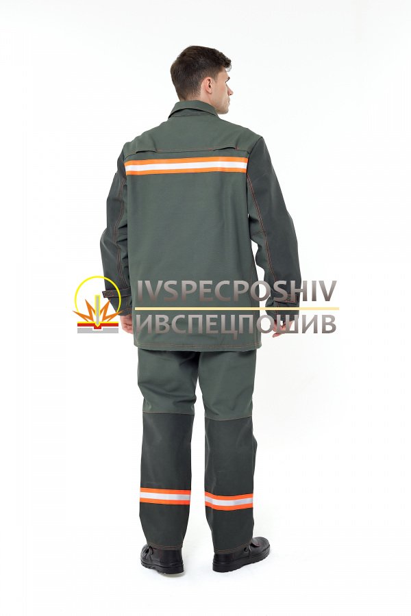 Задние половинки брюк с вытачками, состоят из двух частей: верхней и нижней. На нижних частях задних половинок брюк расположена световозвращающая полоса шириной 5 см. Задние половинки с притачной спинкой, с бретелями, пристегивающимися на защелку-трезубец. Длина бретелей регулируется «открытой» эластичной лентой.