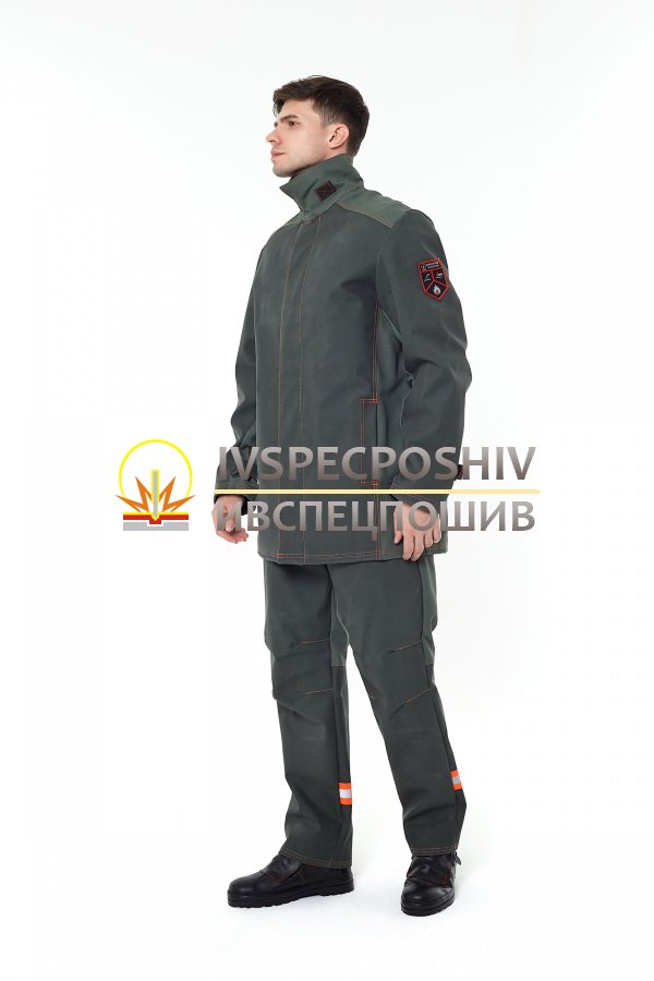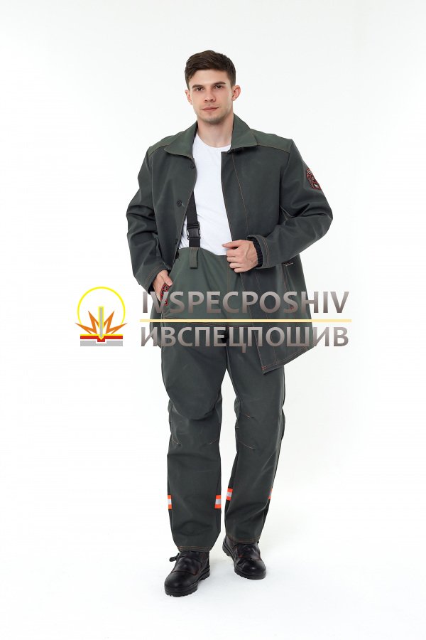 Брюки прямого силуэта, с откидывающейся передней частью, с застежкой по двум боковым швам на две обметанные сквозные петли и пуговицы.  На поясе 5 шлевок: две – посередине передних половинок, две – у боковых швов в сторону задних половинок брюк, одна – у среднего шва брюк. На обтачке передних половинок держатели для застежки-трезубца. Отверстия для воздухообмена расположены на задних половинках брюк в области среднего и шагового швов в виде люверсов.