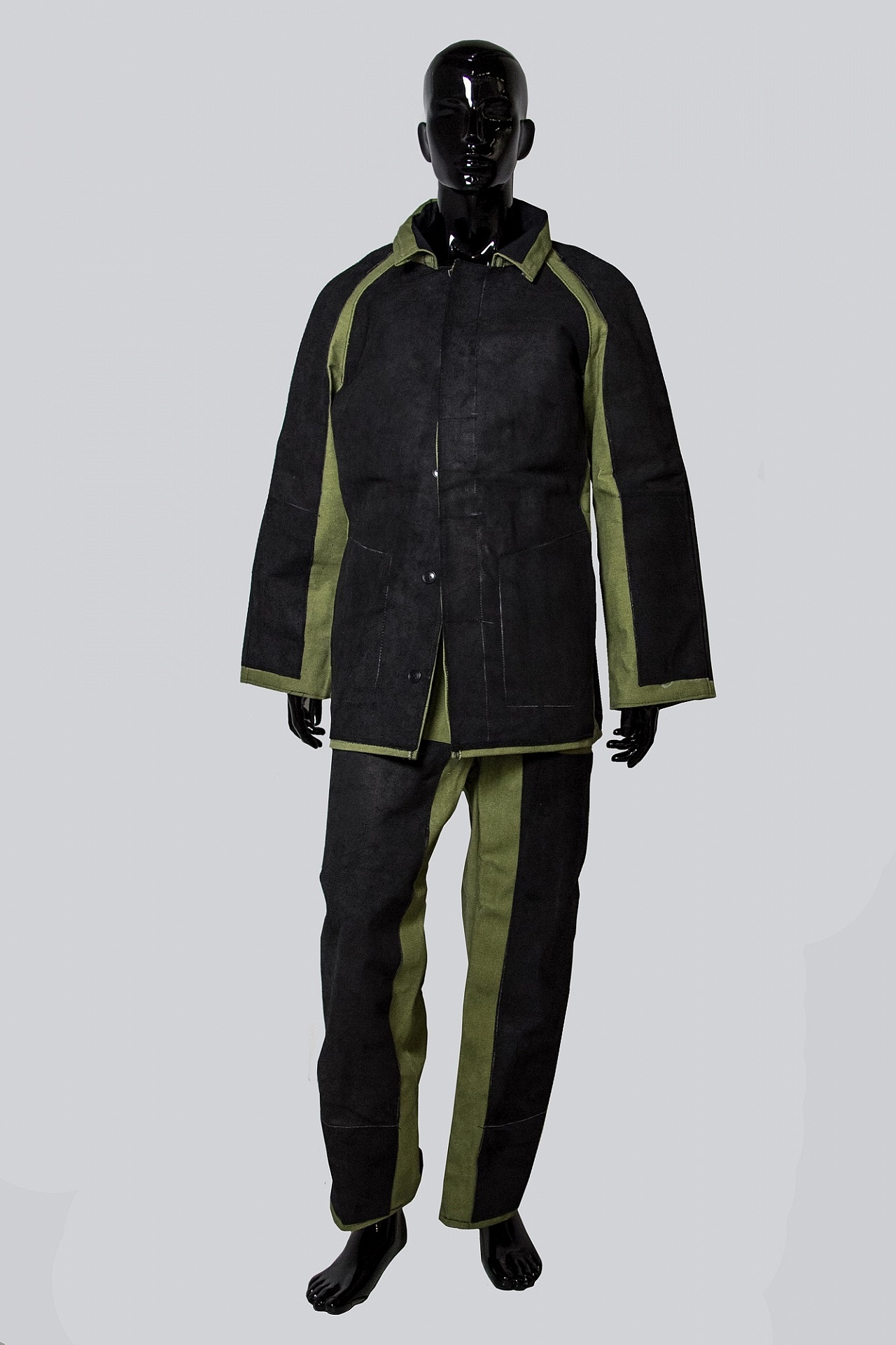 Куртка с потайной застежкой на пуговицы, с двумя боковыми карманами в швах. На спине вентиляционные отверстия. Брюки с застежкой на пуговицах. На полочках, спинке,  передних, задних частях рукавов, передних половинках брюк настрочены накладки из кожевенного спилка высокого качества. Обеспечивает защиту при работе с повышенными температурами: теплового излучения, искр и брызг расплавленного металла, а также при контакте с нагретыми поверхностями до 100 С и конвективным теплом.