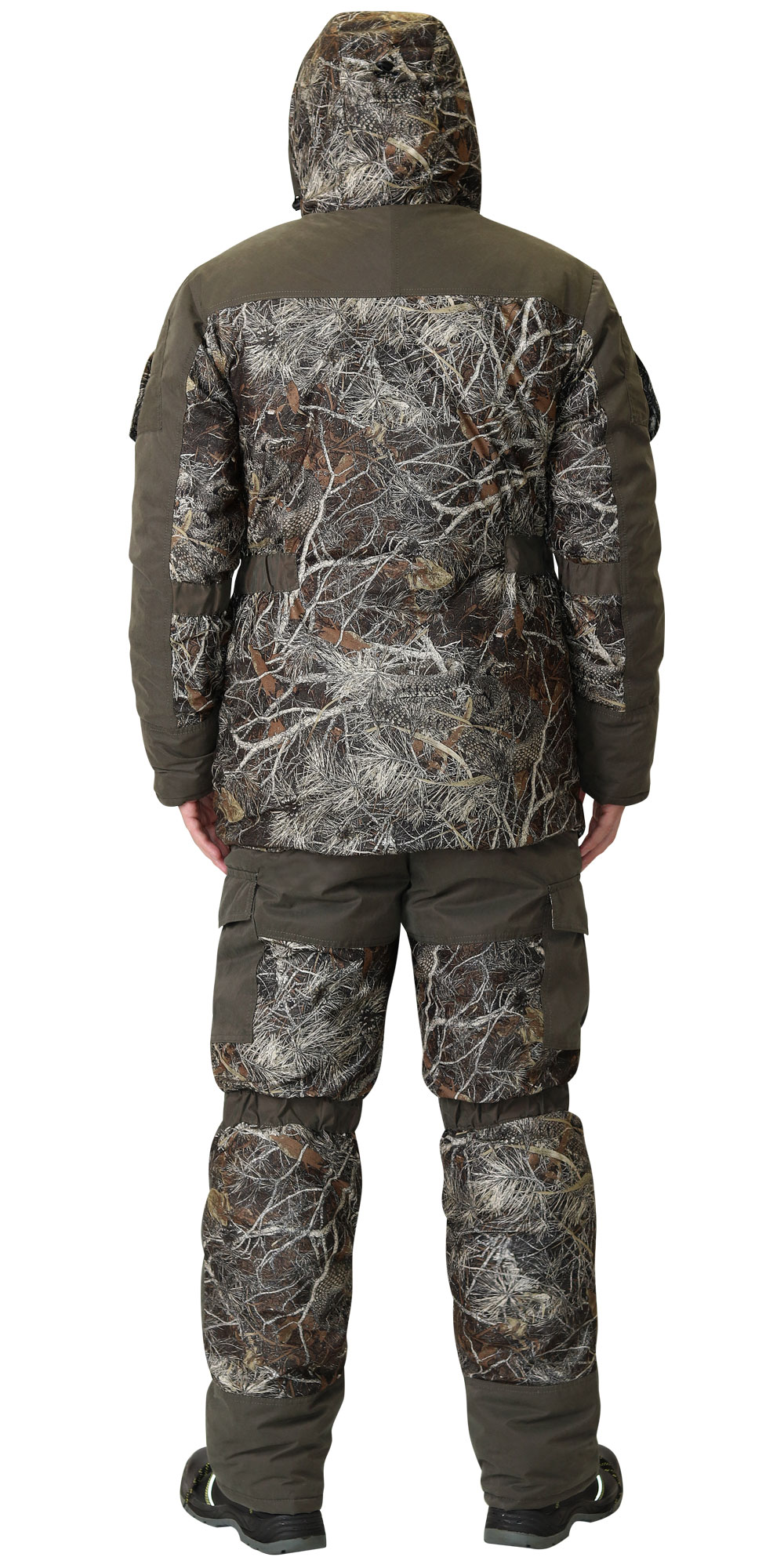 Куртка удлиненная прямого силуэта; с притачной утеплённой подкладкой, с центральной застёжкой на двухзамковую тесьму - «молнию» и ветрозащитным клапаном застегивающийся на потайные кнопки 5шт, с подпланкой, втачным капюшоном, верхними прорезными карманами застегивающиеся на тесьму «молния», с нижними накладными фигурными полуобъемными карманами «антивор» и фигурными клапанами застегивающиеся на потайную кнопку. Рукава втачные, с полуобъемными накладными карманами и фигурными клапанами застегиваются на потайную кнопку. Капюшон с двумя кулисами для регулировки прилегания. Низ куртки регулирует шляпной резинкой и фиксатором. На подкладке внутренний карман на молнии. Полукомбинезон - прямой, утепленный, с центральной застёжкой на двухзамковую тесьму - «молния», с ветрозащитным клапаном, с притачными грудкой и спинкой, с внутренними боковыми карманами с фигурным входом, с боковыми накладными карманами на боковых швах брюк с фигурным клапаном, застегивающимся на потайную кнопку, с настрочным поясом, по спинке в поясе на всю ширину вставлена ткацкая резинка, в области колена стяжка по кулиске на ткацкую резинку задних половинках полукомбинезона для лучшего прилегания, с бретелями регулирующийся за счет эластичной тесьмы и держателей-фастексов. Ткань верха: "Алова" мембрана, состав - 100% п/э, КМФ "Змея". Ткань верха отделочная: «Токио» с ВО пропиткой: состав 85% п/э 15% нейлон. Подкладочная ткань: «Таффета», состав: 100 % - п/э.Утеплитель: Синтепон - 150 г/м2, в куртке - 3 слоя (итого 450 г/м2), в п/к - 2 слоя (итого 300 г/м2).