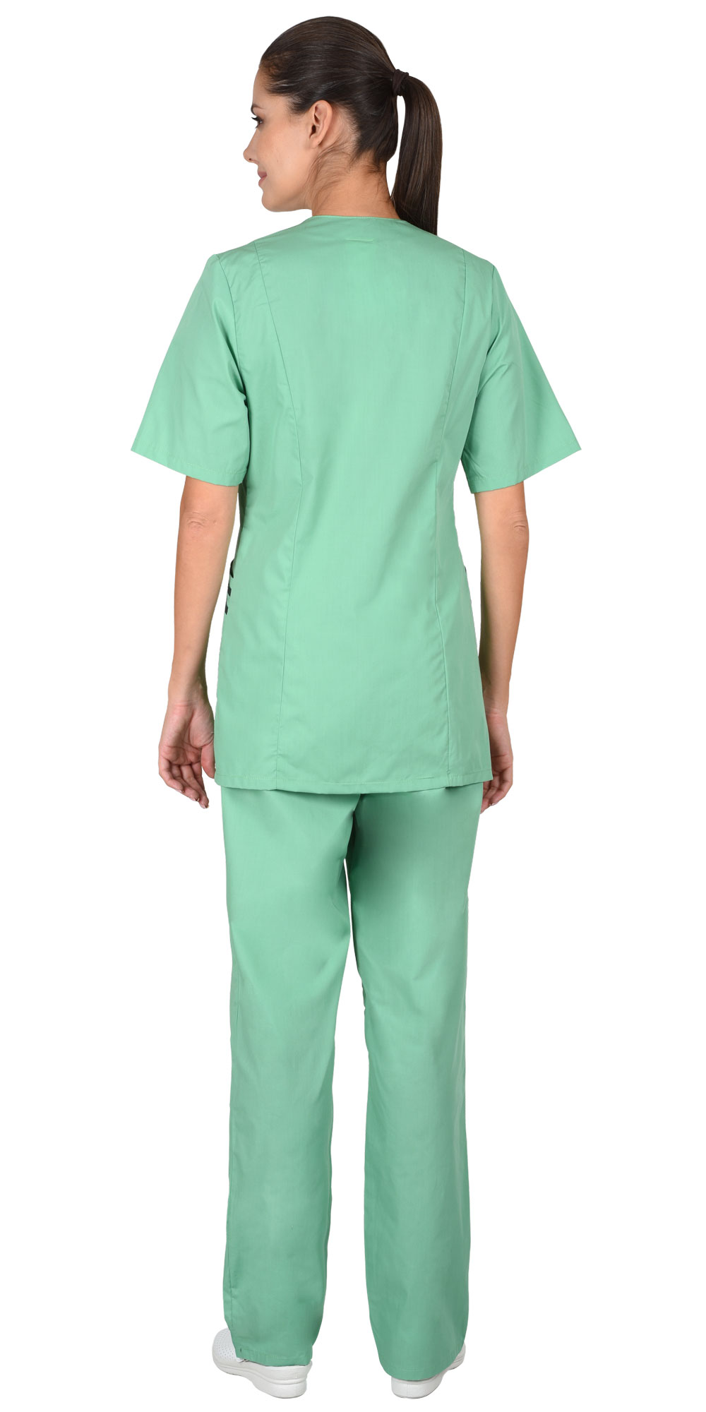 Костюм состоит из блузы и брюк. Блуза приталенного силуэта с застёжкой на пуговицы, короткими рукавами, с отделкой по воротнику и нижним карманам. Брюки прямого покроя без карманов с притачным поясом стянутым резинкой.