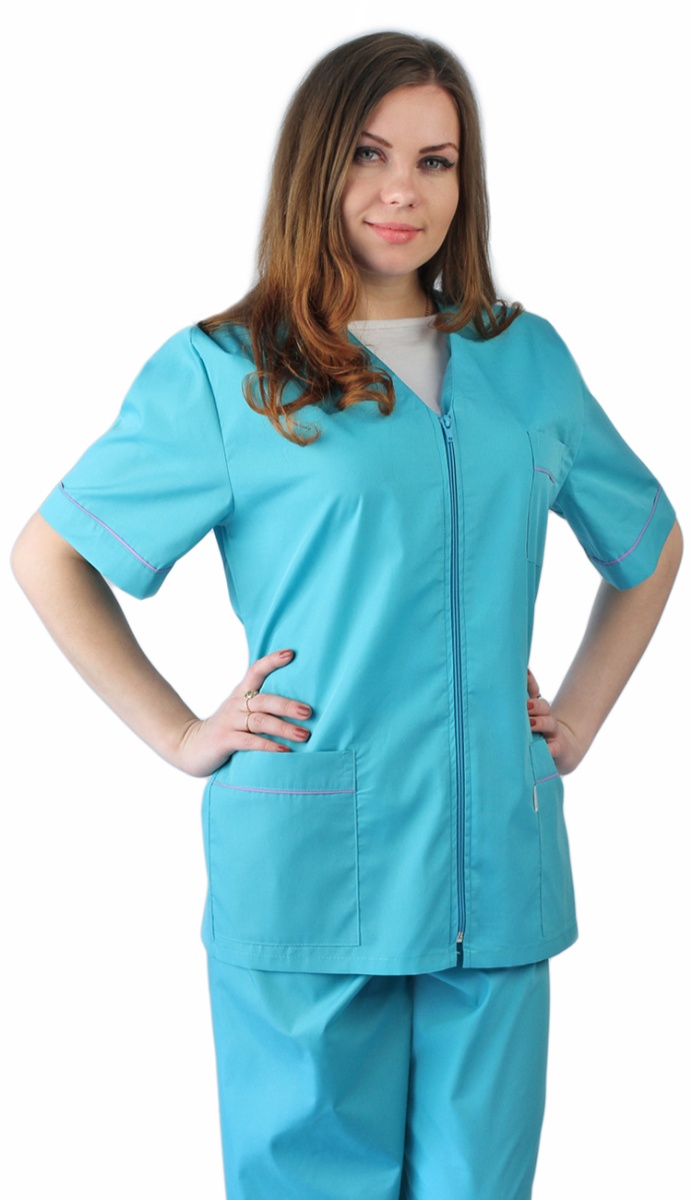 Костюм состоит из блузы и брюк. Блуза полуприлегающего силуэта с центральной застежкой на молнию, V-образным вырезом горловины и короткими рукавами с отделкой из цветного канта. С левой стороны на уровне груди и в нижней части полочки накладные карманы с отделкой из цветного канта. Ширина спинки регулируется поясами, выходящими из боковых швов. Брюки на поясе с резинкой.