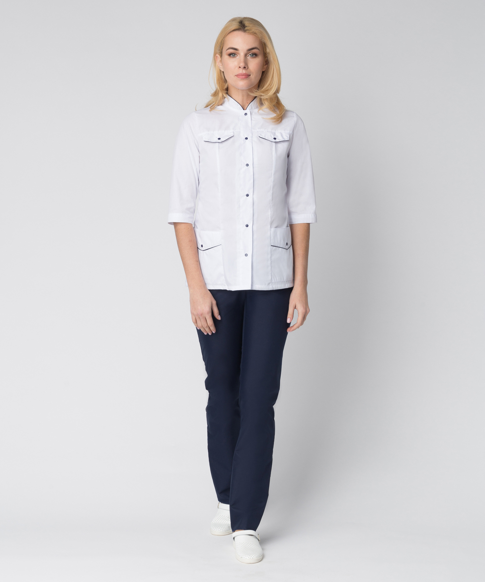 Модная спецодежда для женщин «Орхидея» подчеркивает изящность и утонченный вкус каждой сотрудницы медицинского учреждения, салона красоты, массажного кабинета или стоматологии. Костюм женский рабочий состоит из двух предметов: блуза + брюки женские. Спецодежда изготовлена в соответствии с ГОСТ, надежно защищает от общих производственных загрязнений. Удлиненная блузка полуприталенного силуэта подчеркивает фигуру, не стесняет движения и регулируется по линии талии с помощью вшивного пояса на кнопках. Для хранения мелочей предусмотрены боковые карманы с клапанами. Прямые рабочие брюки оснащены поясом на резинке для комфортной работы в течение длительного периода времени. Лаконичный и современный внешний вид костюма обеспечивают контрастный дизайн, нагрудные декоративные карманы и синие канты на воротнике и карманах, идеально гармонирующие с синими брюками.