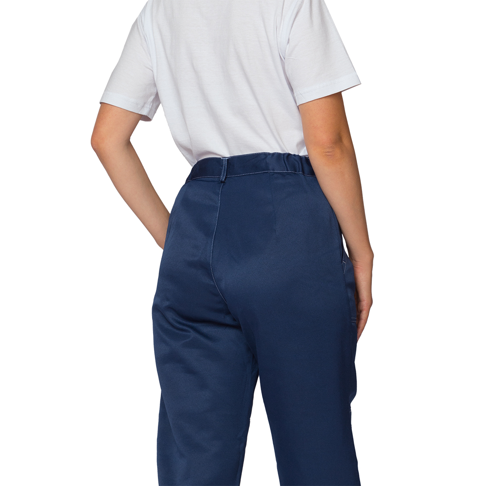 Брюки: прямого силуэта, с центральной застёжкой на молнию, с вытачками на поясе, с 5 шлёвками. Вытачки по линии талии на задней части брюк обеспечивают силуэтную посадку. Пояс брюк в области боковых швов регулируется эластичной тесьмой.