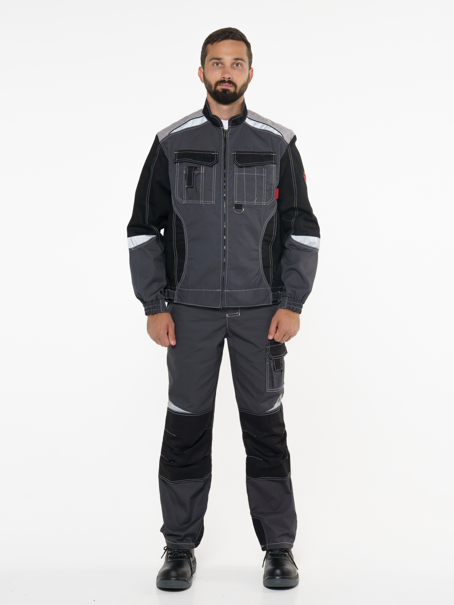 Куртка прямого силуэта; короткая; воротник стойка; с центральной застёжкой на молнию; с верхними фигурными карманами с фигурными клапанами; низ регулируется при помощи хлястиков с полукольцами. ГОСТ 12.4.280-2014