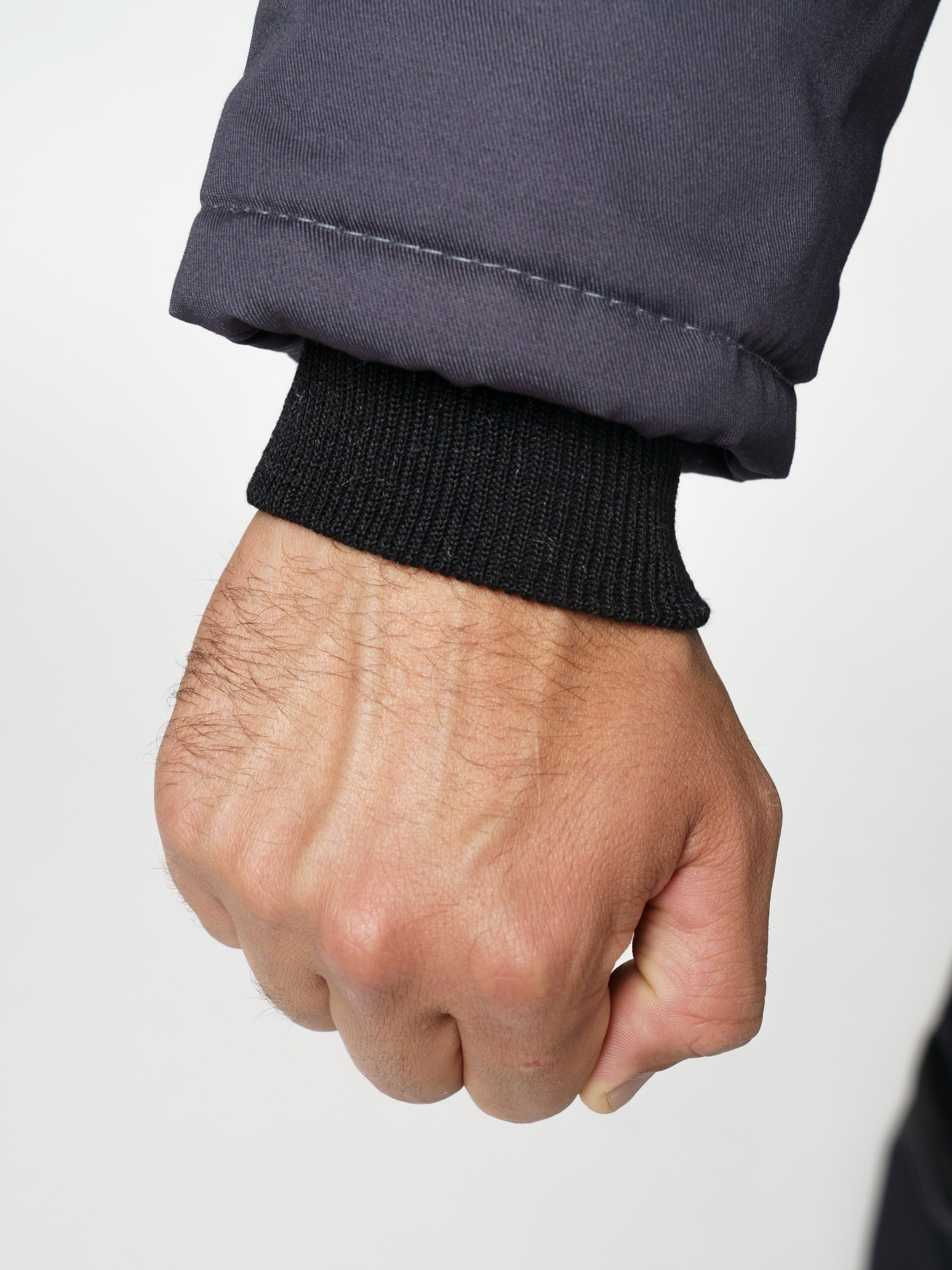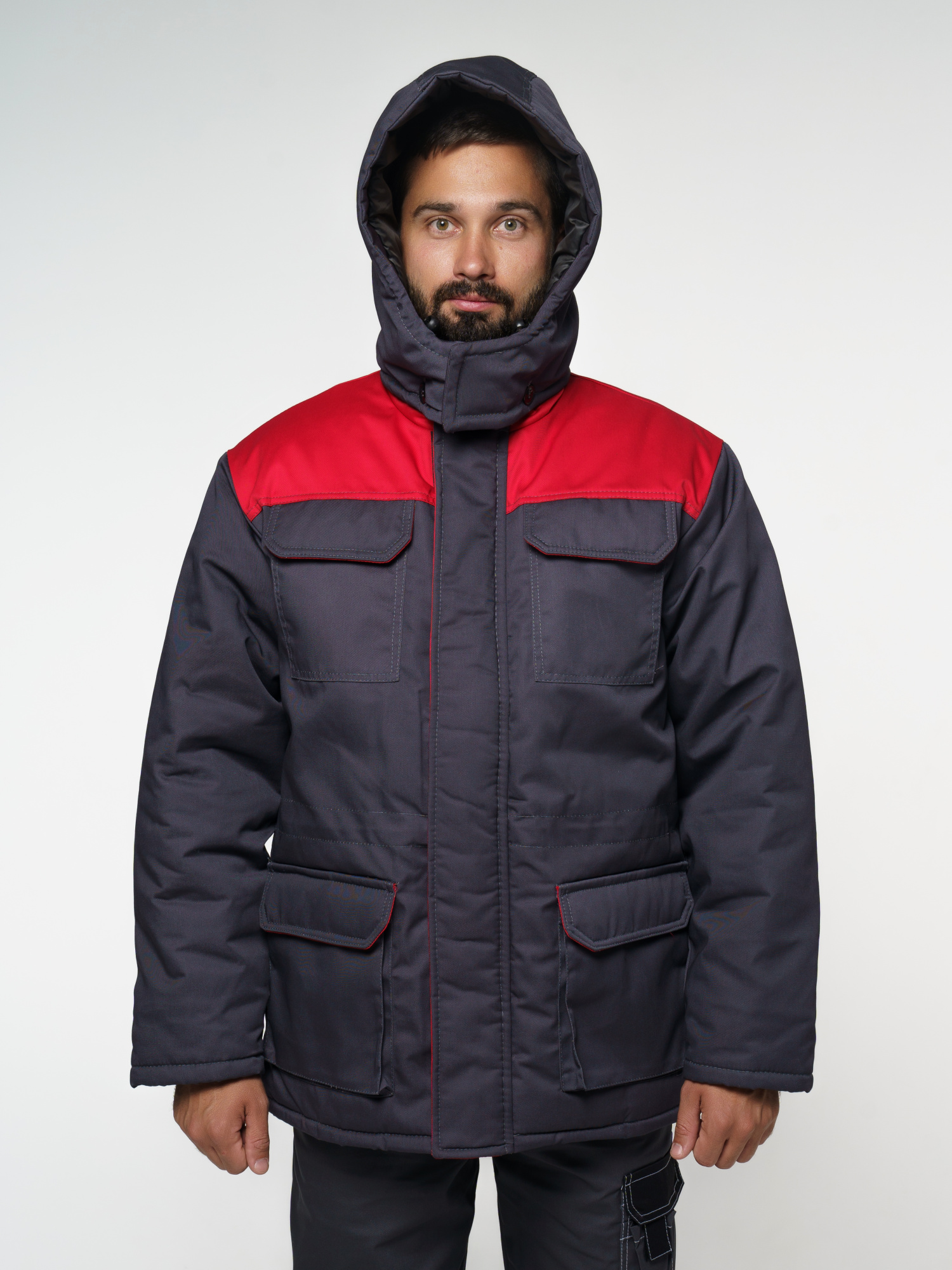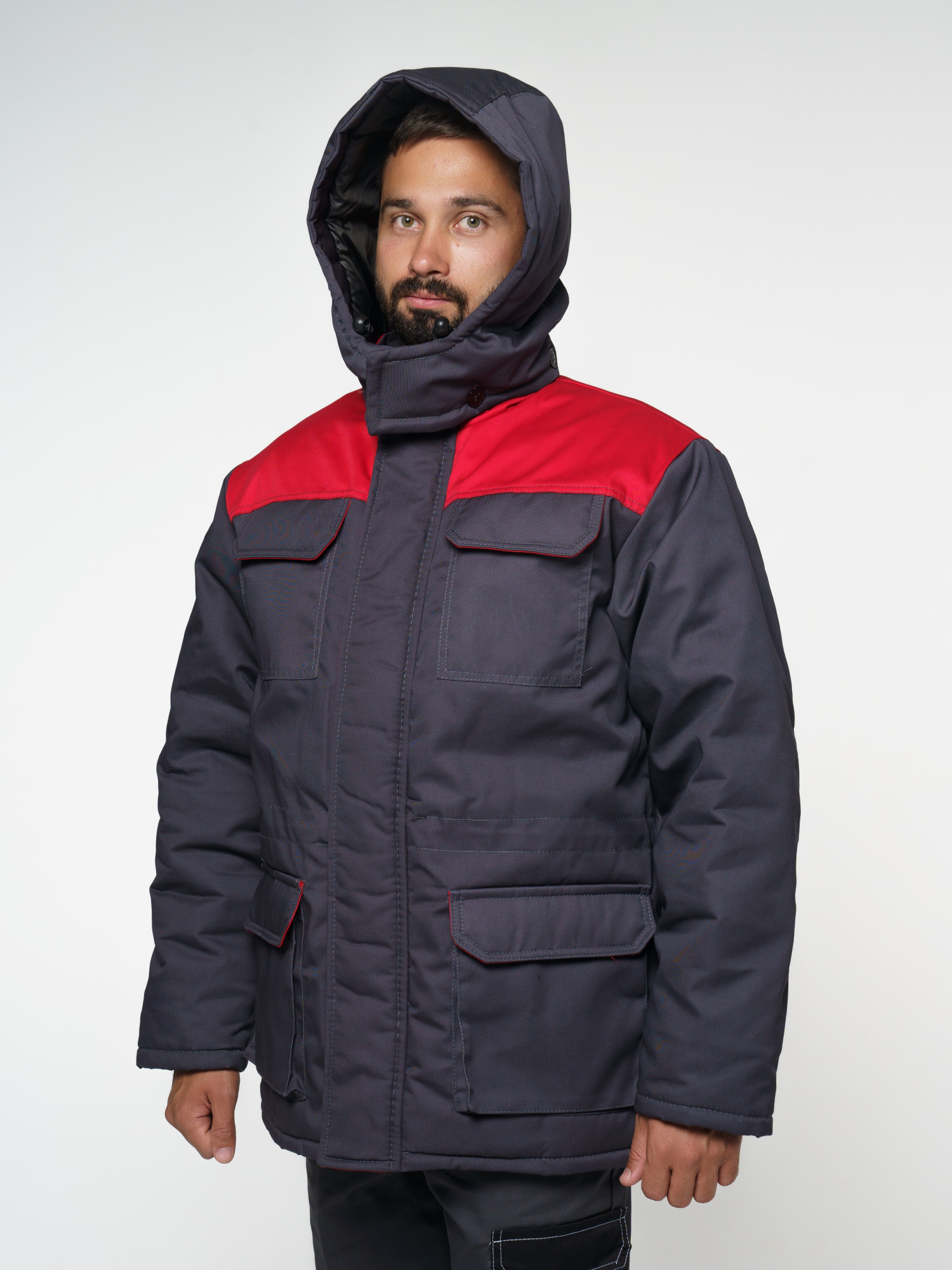 Куртка прямого силуэта, с центральной застежкой на молнию с ветрозащитной планкой на липучках. Нагрудные накладные карманы и нижние объемные накладные карманы-портфель с клапаном на липучках. В рукавах трикотажные манжеты-напульсники. По линии талии кулиса со шнуром-резинкой и фиксатором. Воротник-стойка. Съемный утепленный капюшон на пуговицах, по лицевому вырезу кулиса со шнуром-резинкой и фиксаторами, по лицевой части застегивается на липучки. Подкладка простегана с утеплителем, внутренний накладной карман на левой полочке.