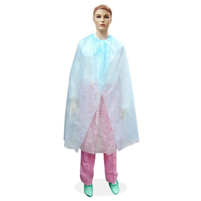 Накидка для посетителей голубого цвета без рукавов изготовлена из воздухопроницаемого первичного нетканого полипропилена.