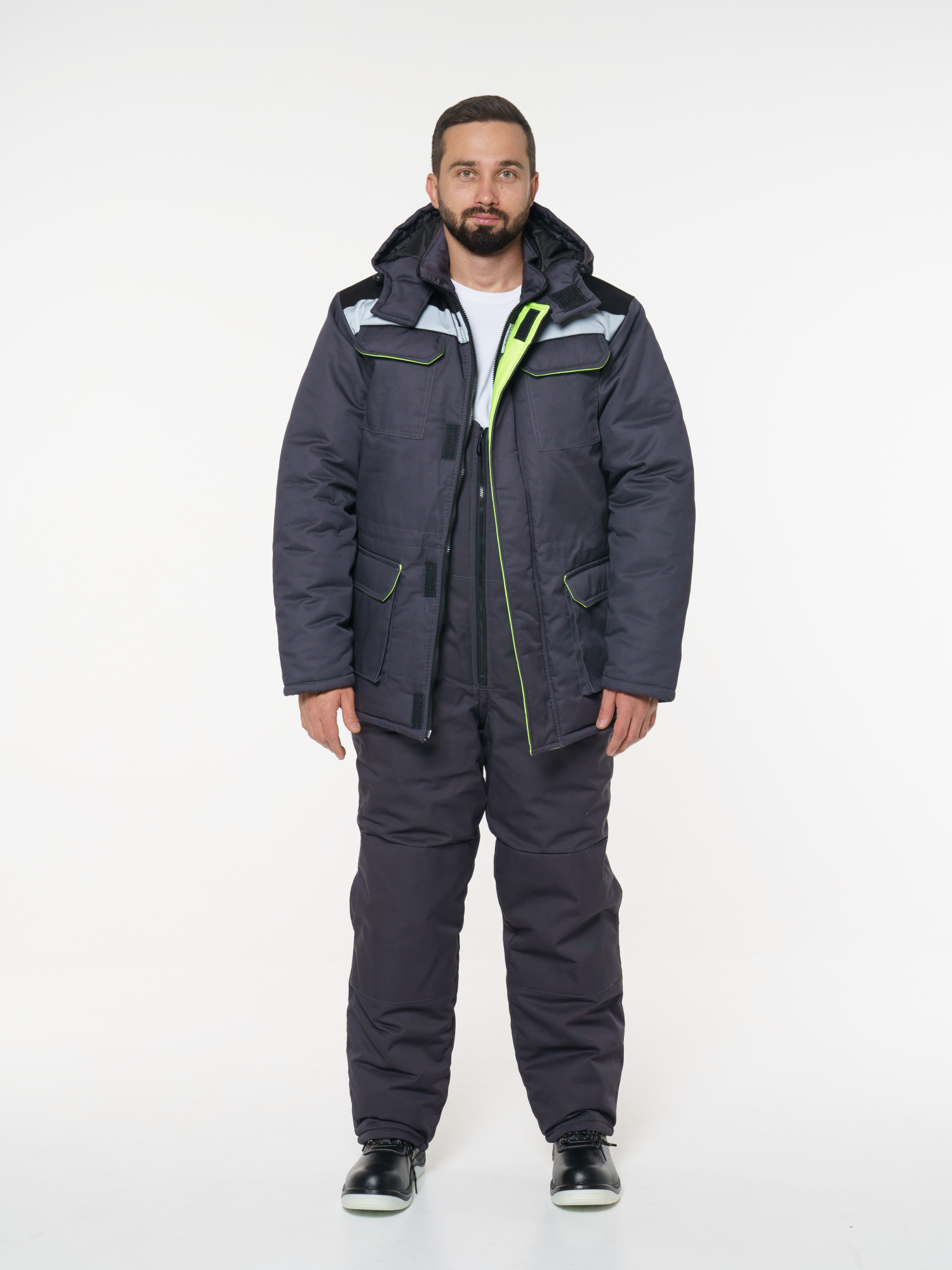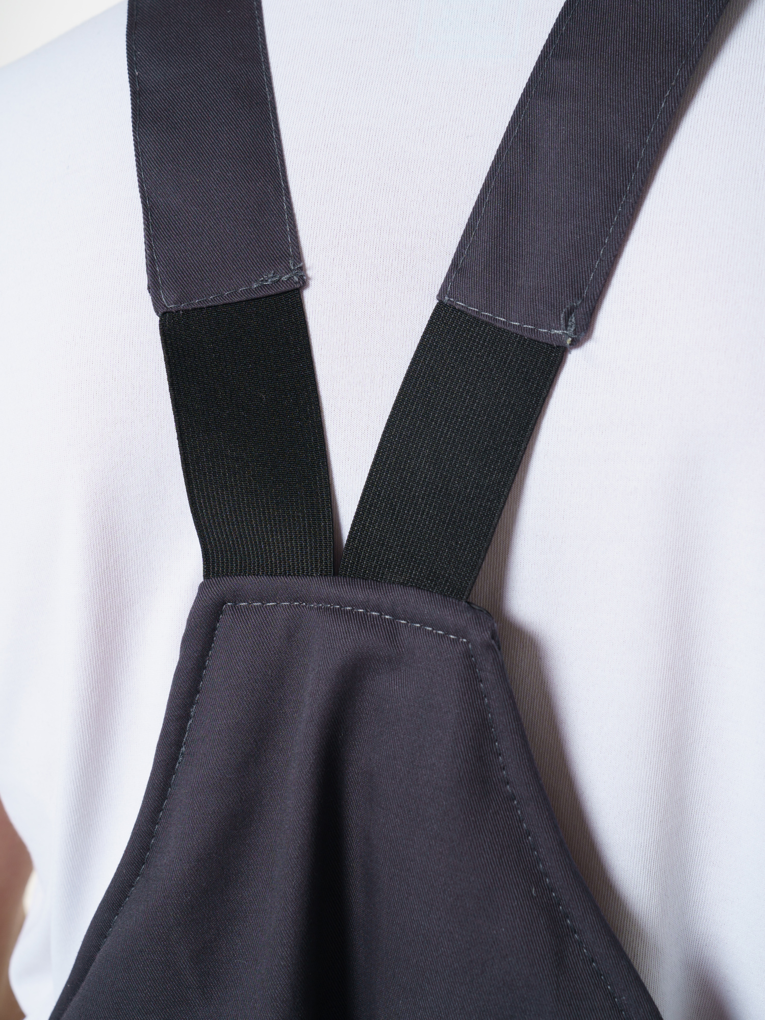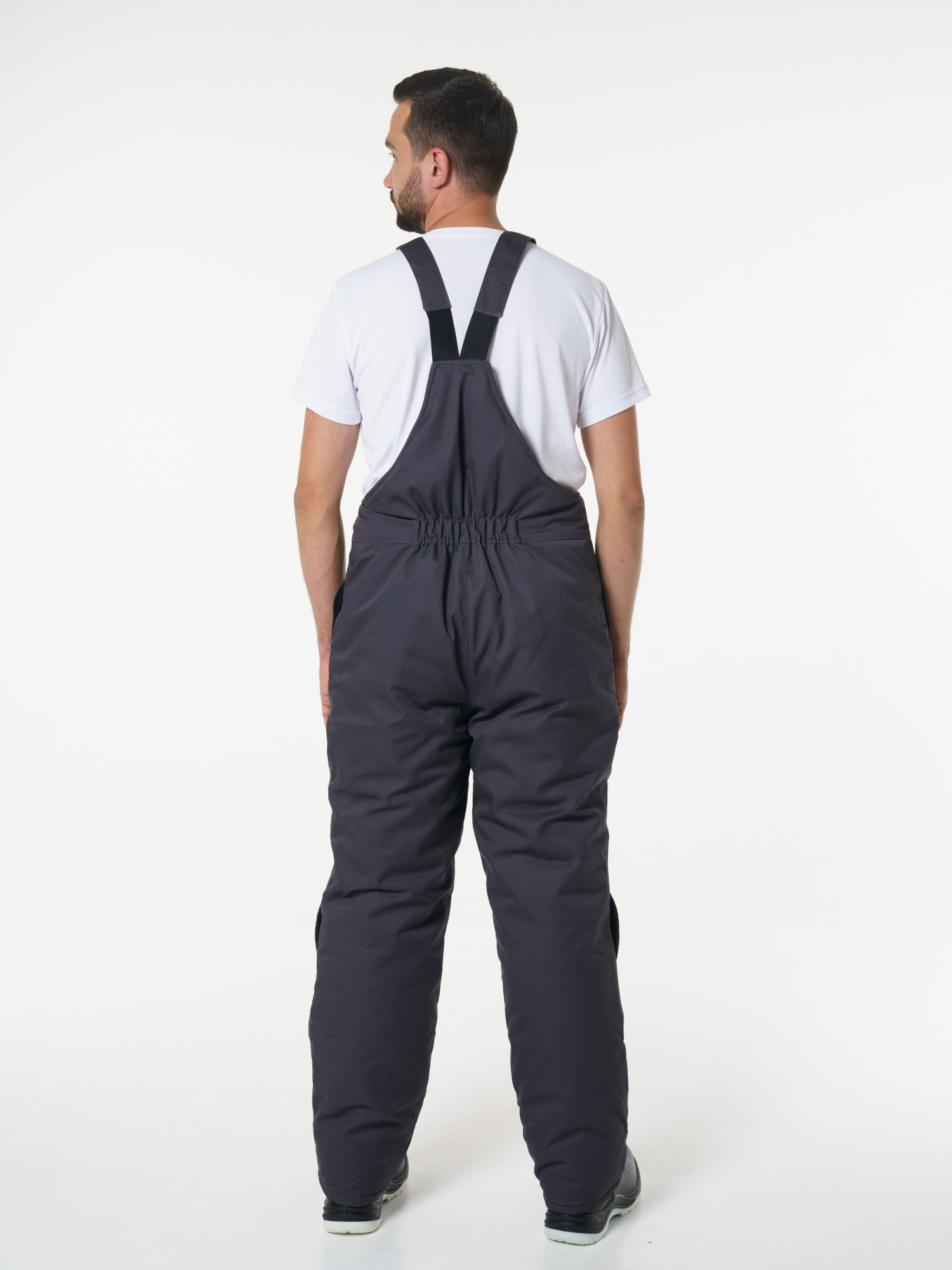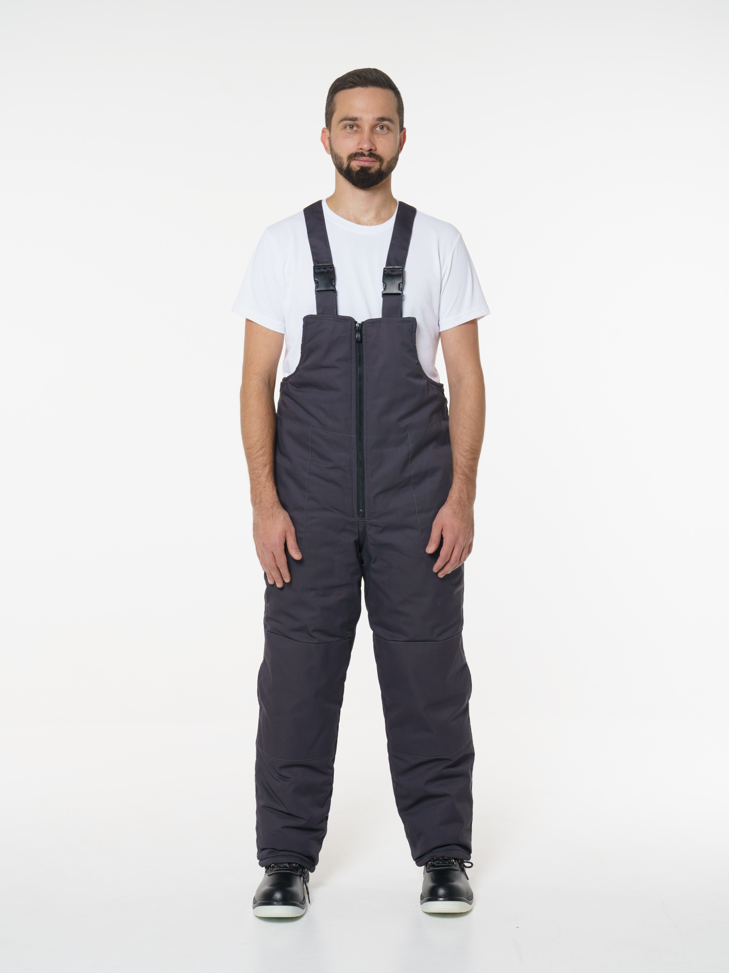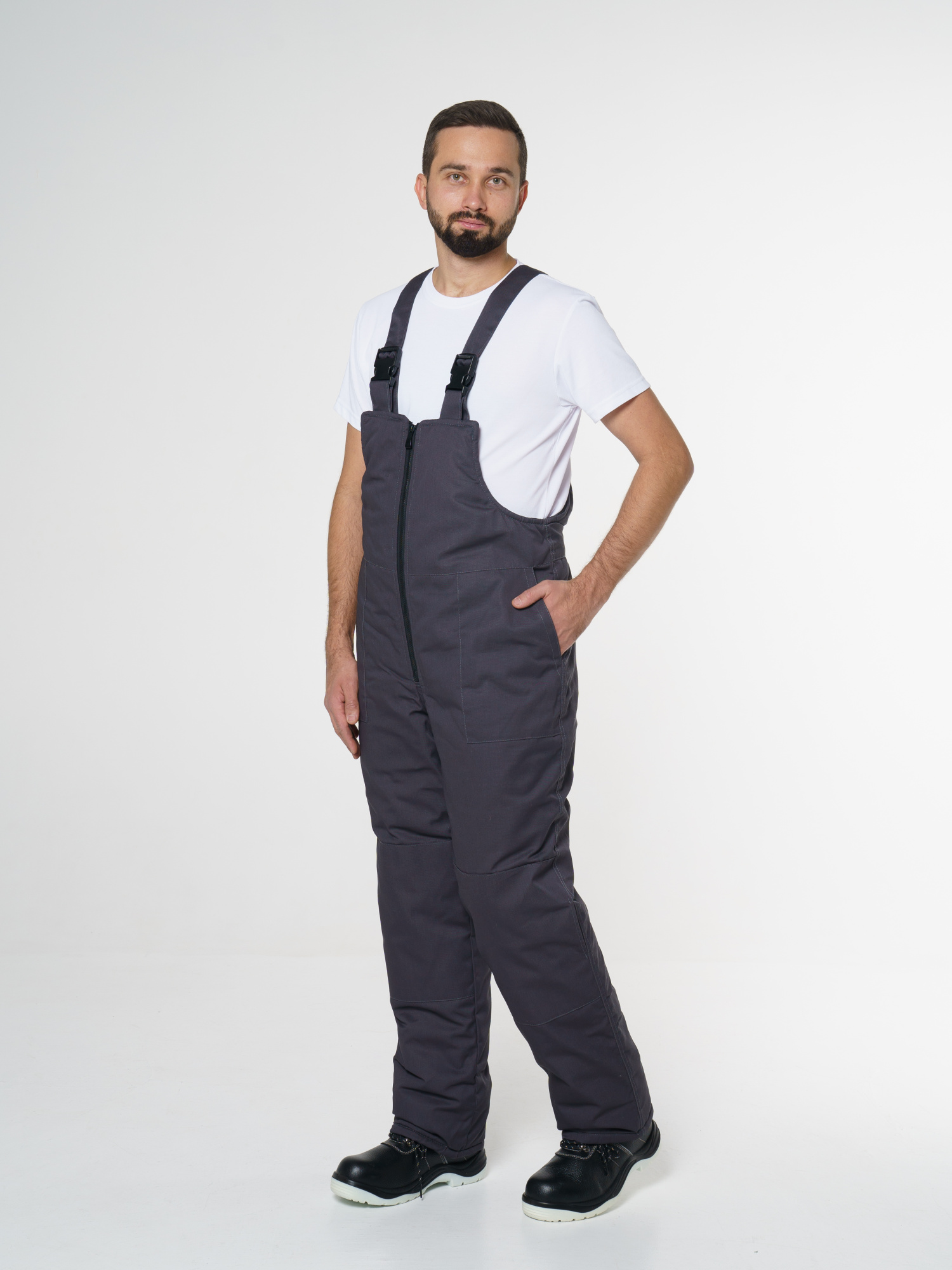 Полукомбинезон прямого силуэта с центральной застежкой на молнию. С высокой грудкой и спинкой, на регулируемых бретелях с резинкой и фастексами. Объемные боковые накладные карманы с косым входом. По талии спинки кулиса на резинке. Усилительные вставки в зоне коленей с возможностью установить наколенники.