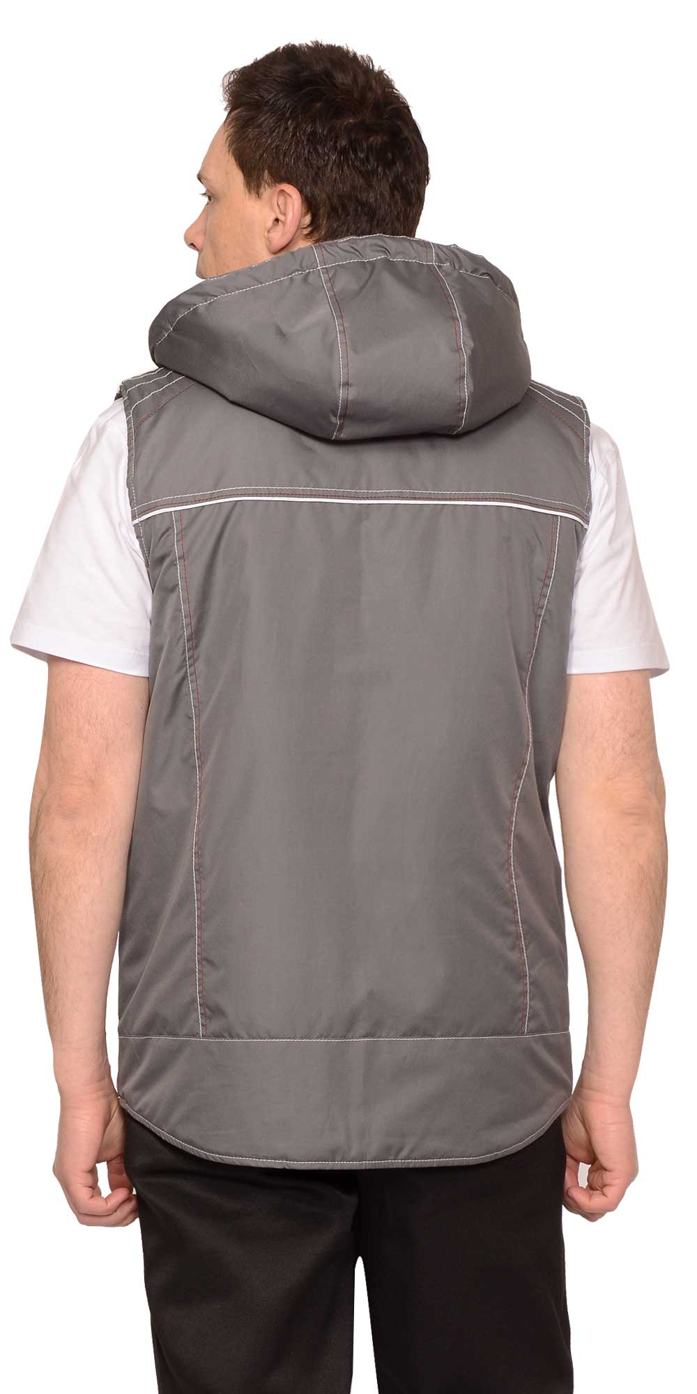 Жилет, с утеплённой подкладкой, однотонный с отделочными строчками и отделочным кантом контрастного цвета. Жилет с воротником стойка, с застёжкой на молнию, с внутренним ветрозащитным клапаном, со съёмным капюшоном, который пристёгивается к воротнику на молнию. Спинка жилета, удлинённая с фигурной линией низа. Жилет с одним нагрудным карманом с молнией и двумя нижними боковыми карманами. Внутренний воротник из флиса. Объём капюшона по лицевому вырезу регулируется шнуром с фиксаторами. Подкладка с утеплителем, с внутренним карманом с молнией. В жилете предусмотрен световозвращающий кант, что обеспечивает видимость при любом освещении.