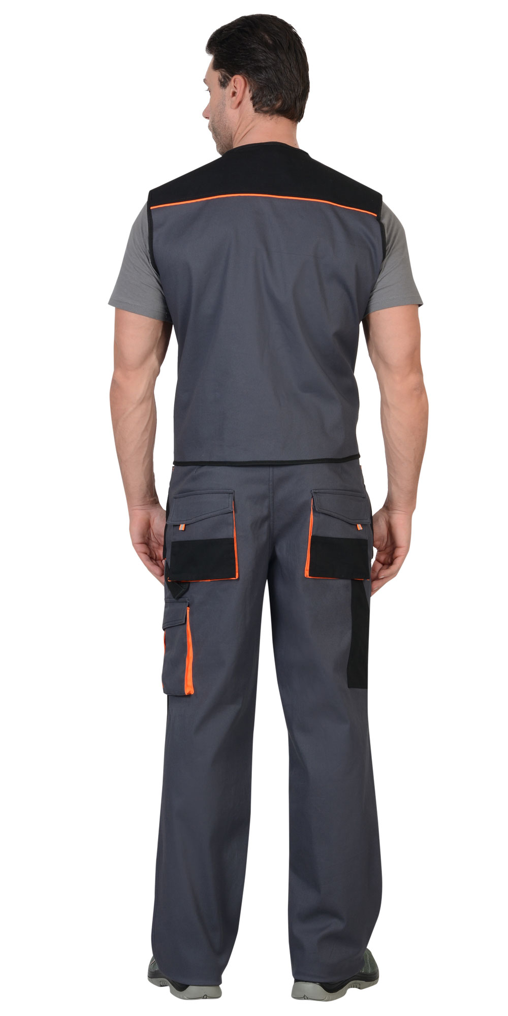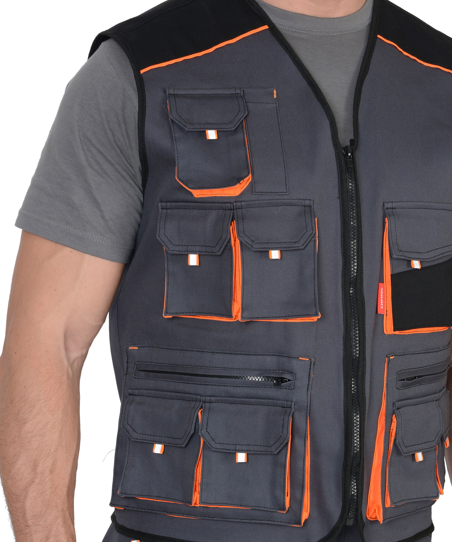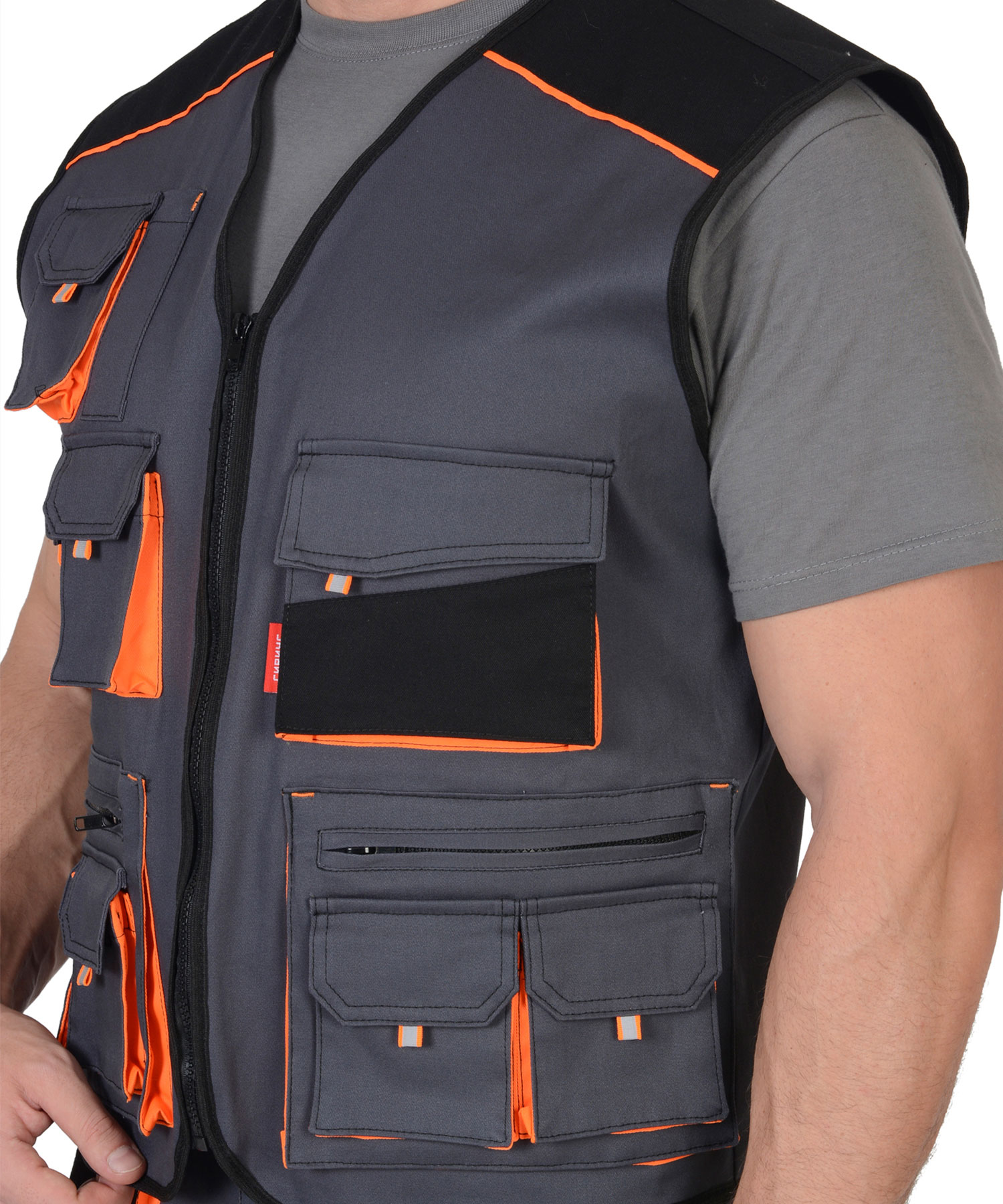 Жилет с застежкой на тесьму - "молния"; с верхними, средними и нижними многофункциональными объемными карманами с клапанами, с кантом из отделочной ткани. В жилете вшивается паты из ленты ранцевой с рефлектором 25/10 СВМ.Ткань основная: "Стрейч" 98% х/б 2% эластан, поверхностная плотность 250 г/м2. Цвет: темно серый.