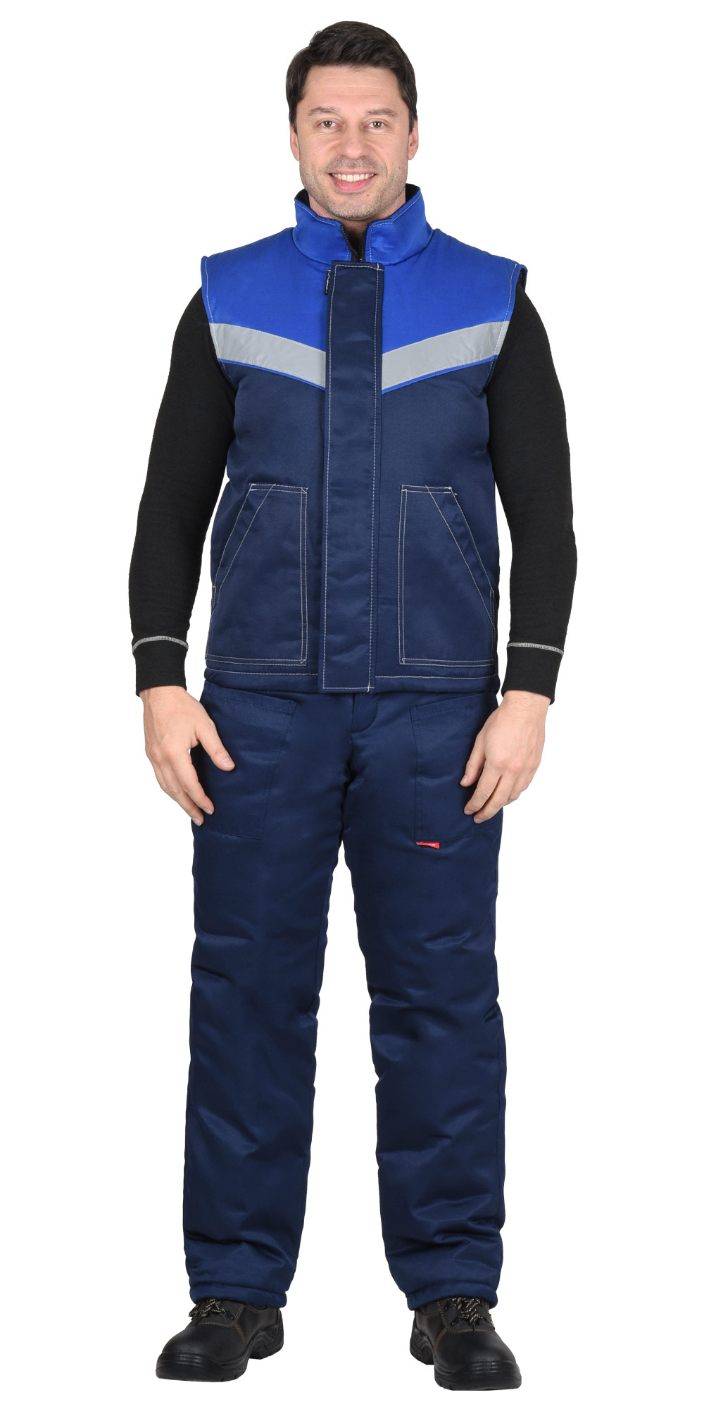 Жилет утепленный, с центральной бортовой застёжкой на тесьму - «молнию», с ветрозащитной планкой застегивающийся на потайные липучки 3шт., с накладными карманами с косым входом, с внутренним карманом застегивающийся на тесьму - «молния», с фигурной линией низа. В жилете предусмотрен лента светоотражающая (серая) 50мм 100% п/э для обеспечения сигнальной видимости в условиях пониженной видимости.