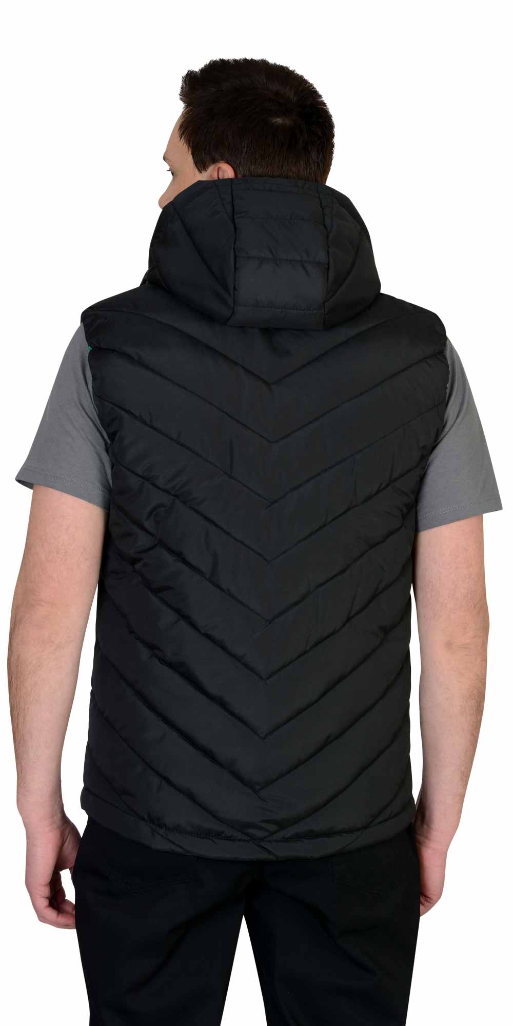 Жилет утепленный прямого силуэта, с притачным капюшоном, с центральной застежкой на тесьму «молния», полочка с двумя нижними карманами в рельефах на «молнии», все детали жилета простеганы, с внутренней стороны на левой полочке расположен накладной карман на молнии, спинка удлиненная.