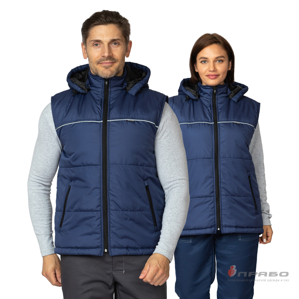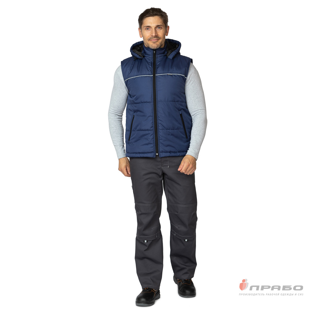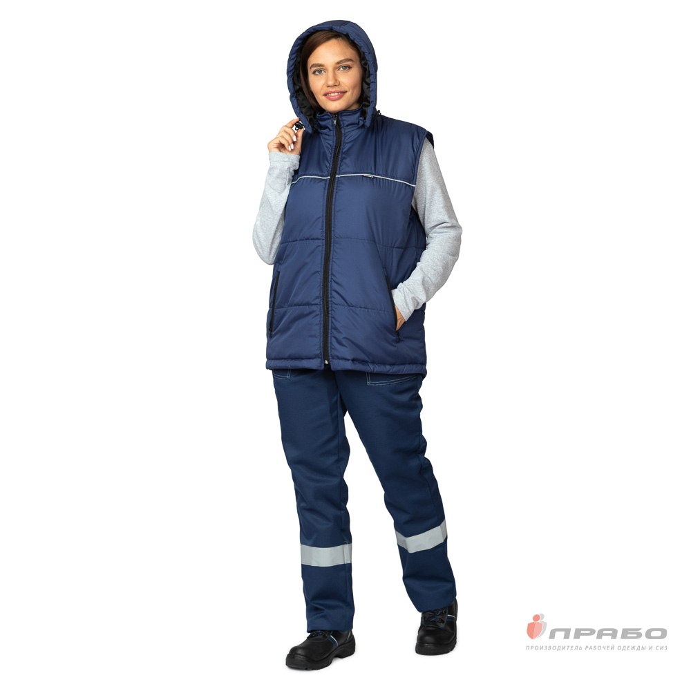 Жилет: утеплённый, прямого силуэта, с центральной застёжкой на тесьму «молнию». Стёганный двумя горизонтальными строчками. Спинка жилета удлинённая с фигурной линией низа. Воротник-стойка, внутренний воротник выполнен из флиса. Низ жилета регулируется по объёму с помощью кулиски с эластичным шнуром и фиксаторами.