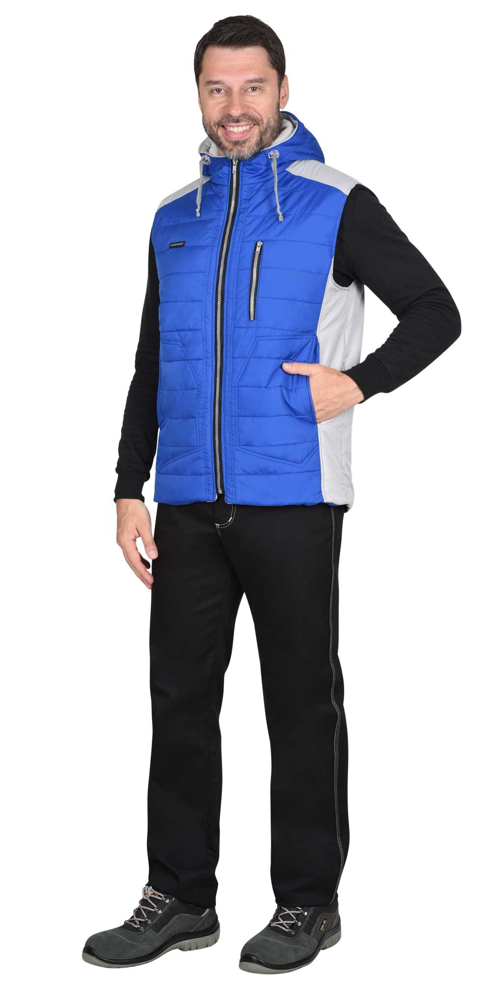Жилет комбинированный из ткани двух цветов, утепленный, с центральной бортовой застёжкой на тесьму «молния», с верхним левым прорезным карманом в рамку застегивающимся на тесьму «молния», с нижними карманами в рельефе, с втачным капюшоном, с накладным карманом на подкладке с правой стороны застегивающимся на тесьму «молния», с фигурной линией низа по спинки.