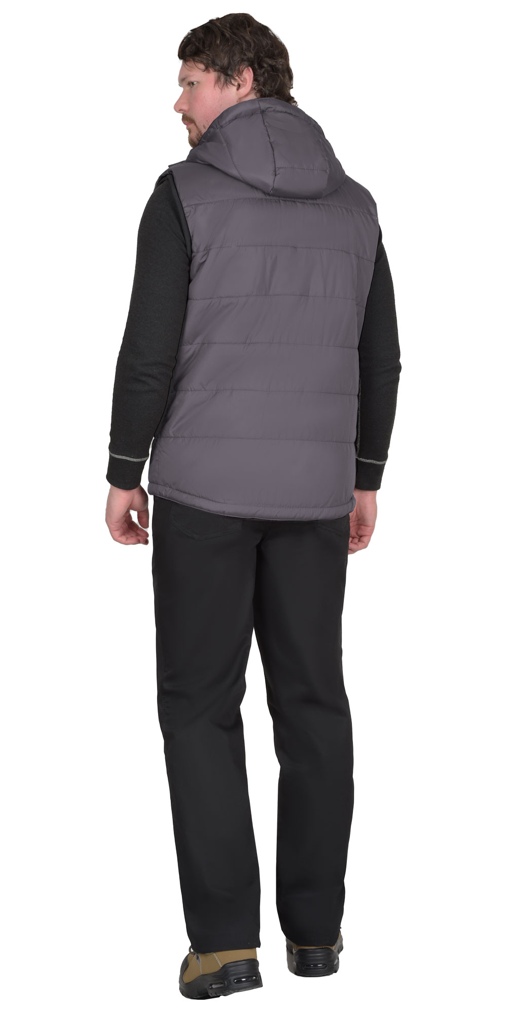 Жилет утеплённый, выстеган с утеплителем горизонтальными строчками, с подкладкой контрастного цвета, с втачным капюшоном, с застёжкой на молнию, закрытую ветрозащитным клапаном, застёгивающимся на кнопки. Жилет с одним нагрудным карманом с молнией и двумя нижними карманами. Спинка жилета, удлинённая с фигурной линией низа. Пройма окантована резинкой. Объём капюшона по лицевому вырезу регулируется шнуром с фиксаторами.